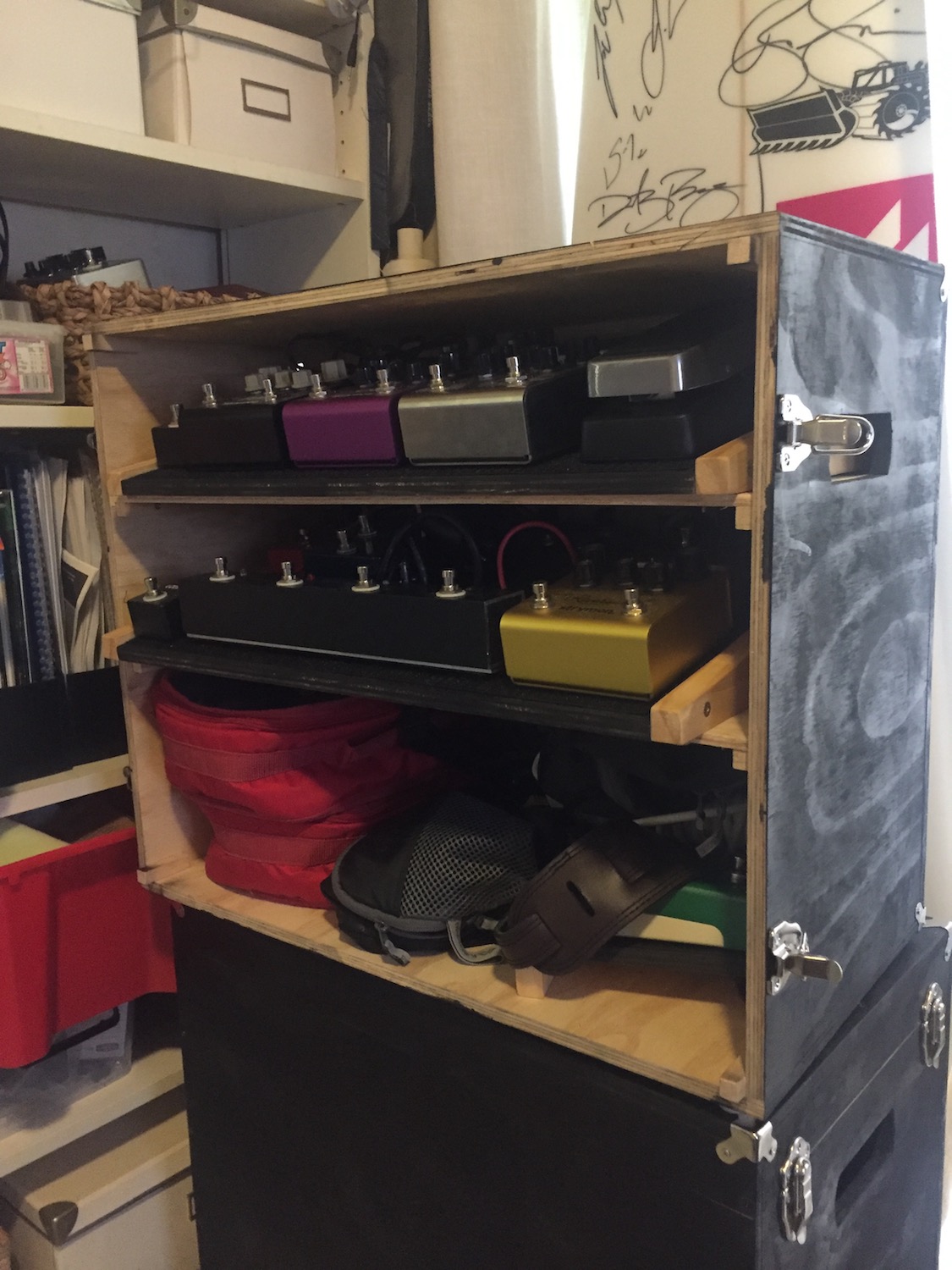 I made three cabinets from 12mm ply that fit on a home-made dolly. The two amps each have their own box, and then there’s a third one that has shelves for the two pedalboards, cables, mics etc. Each box is simply glued and screwed together with case latches and some metal corners (not on all the pics). I painted them with the cheapest spray I could find and didn't worry about them being too perfect in finish, just structurally sound. Oh, and I made the pedalboards to suit too - again just ply and pine (still finalising what to put on them!) It works well!