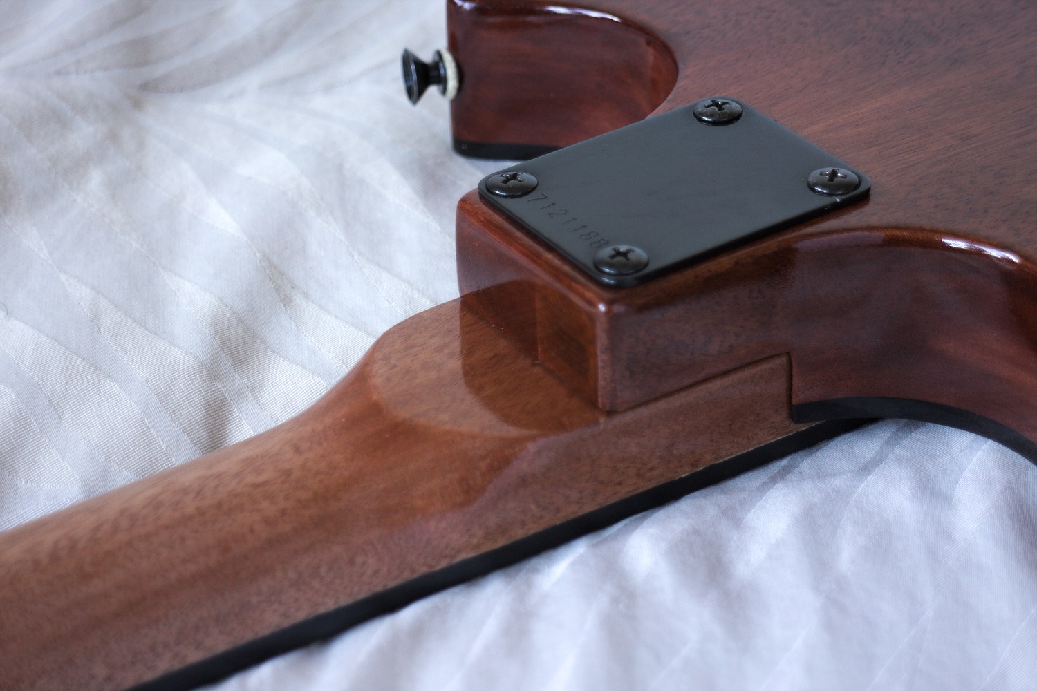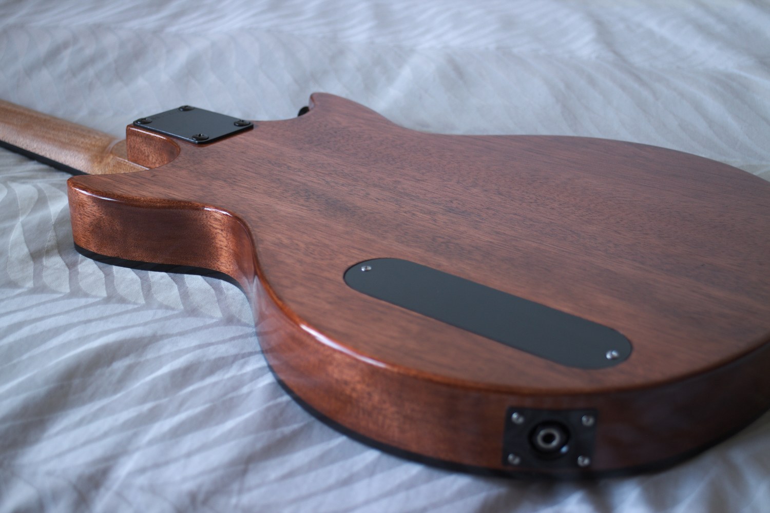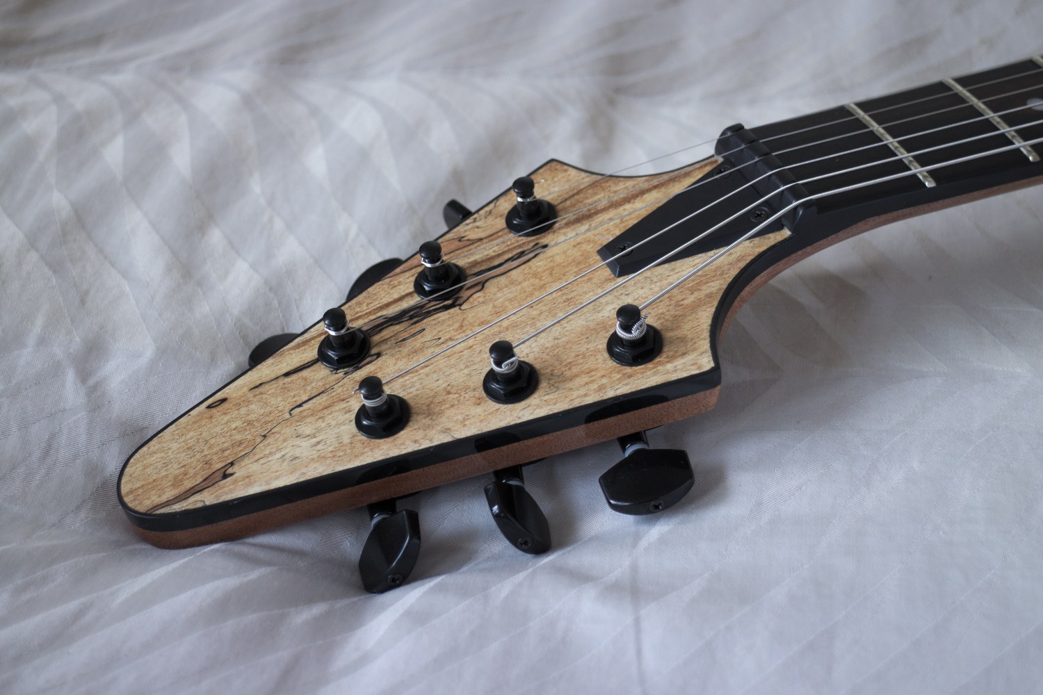 The back and sides of the body are walnut stained with a gloss Danish oil finish. The top is satin Danish oil, which contrasts beautifully and makes the spalted maple just jump out. The neck is unstained, with satin finish in the middle for smooth playing, blending into a gloss finish at the body and headstock.