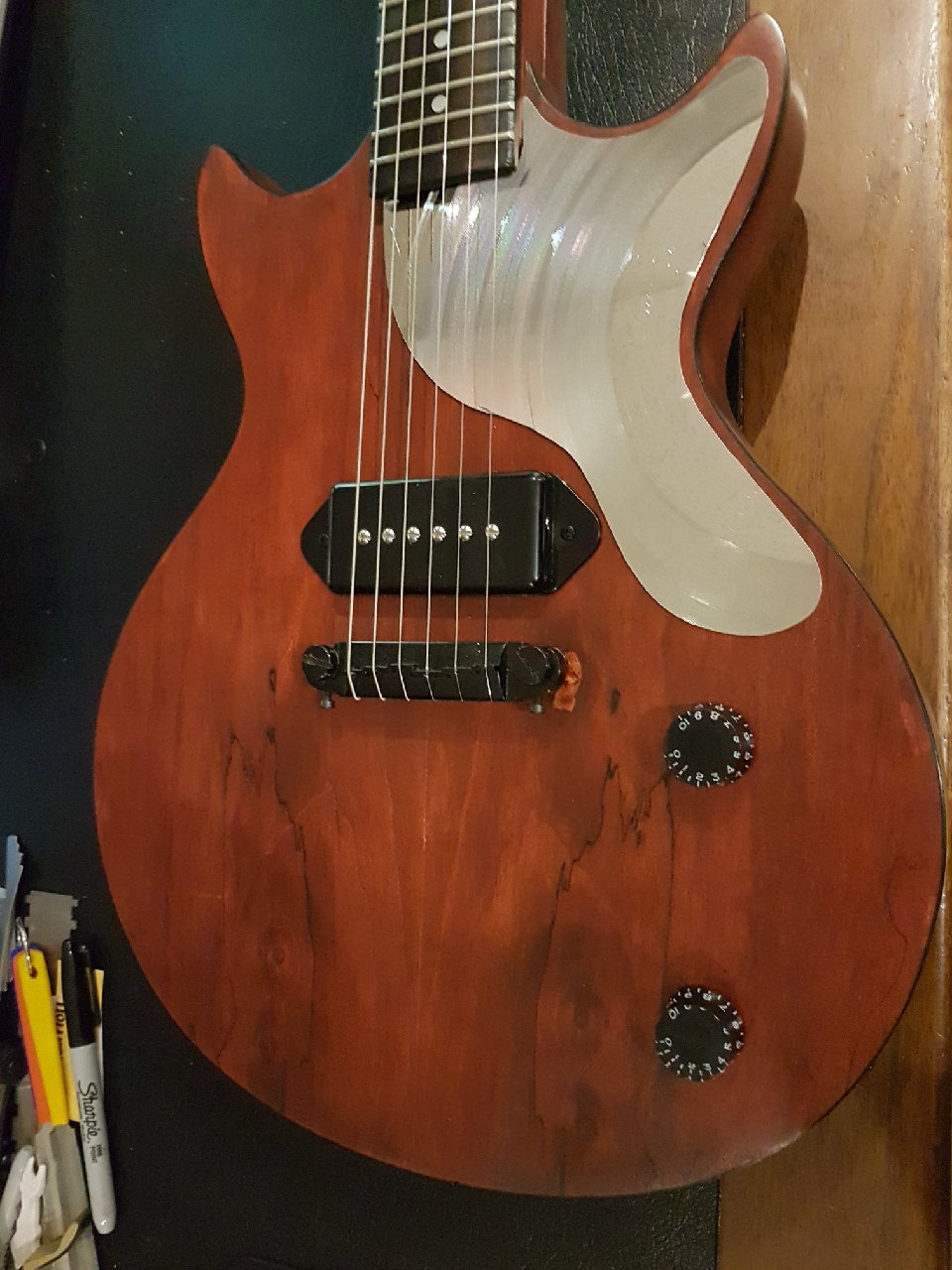 This is my first kit guitar build - I'd been on a bit of a Carcass bender which sent me looking for a LP Junior-style build for a spot of P90 metal action. I fell in love with the spalted maple look of the DM-1S and here we are!