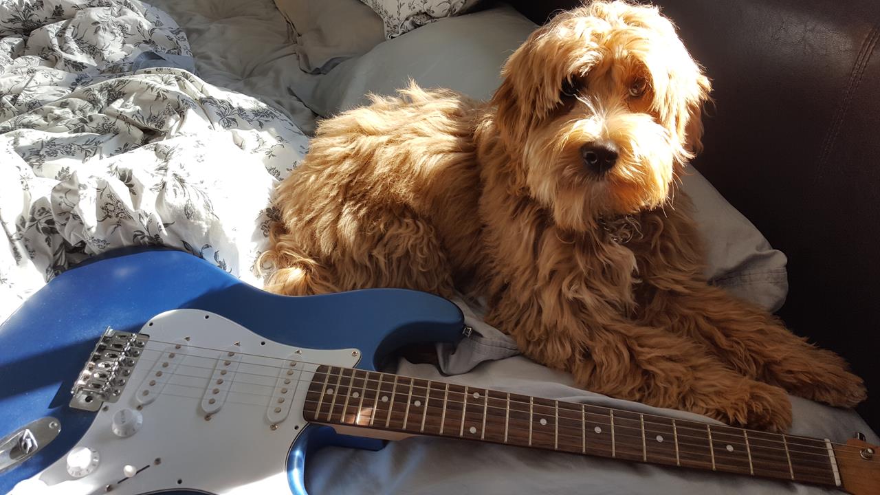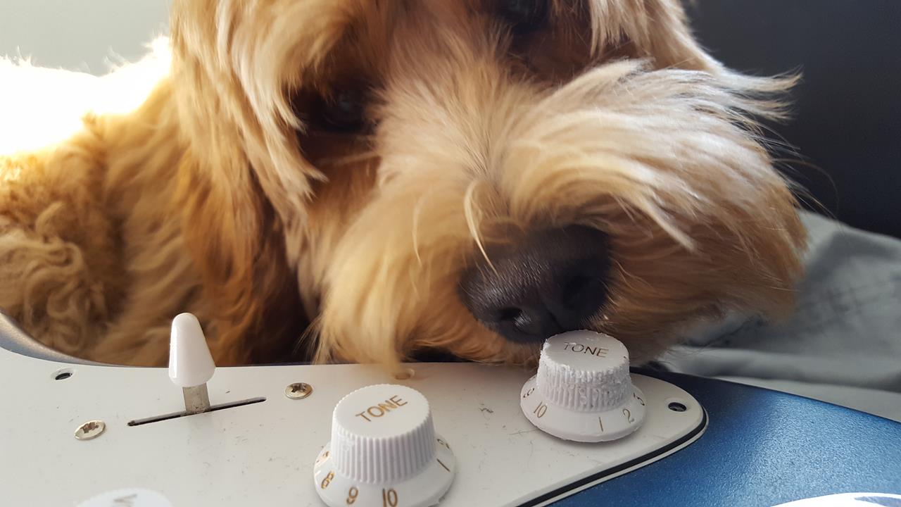 So my growing little buddy found the first kit guitar I ever built, and it seems he's developed a taste for volume knobs.