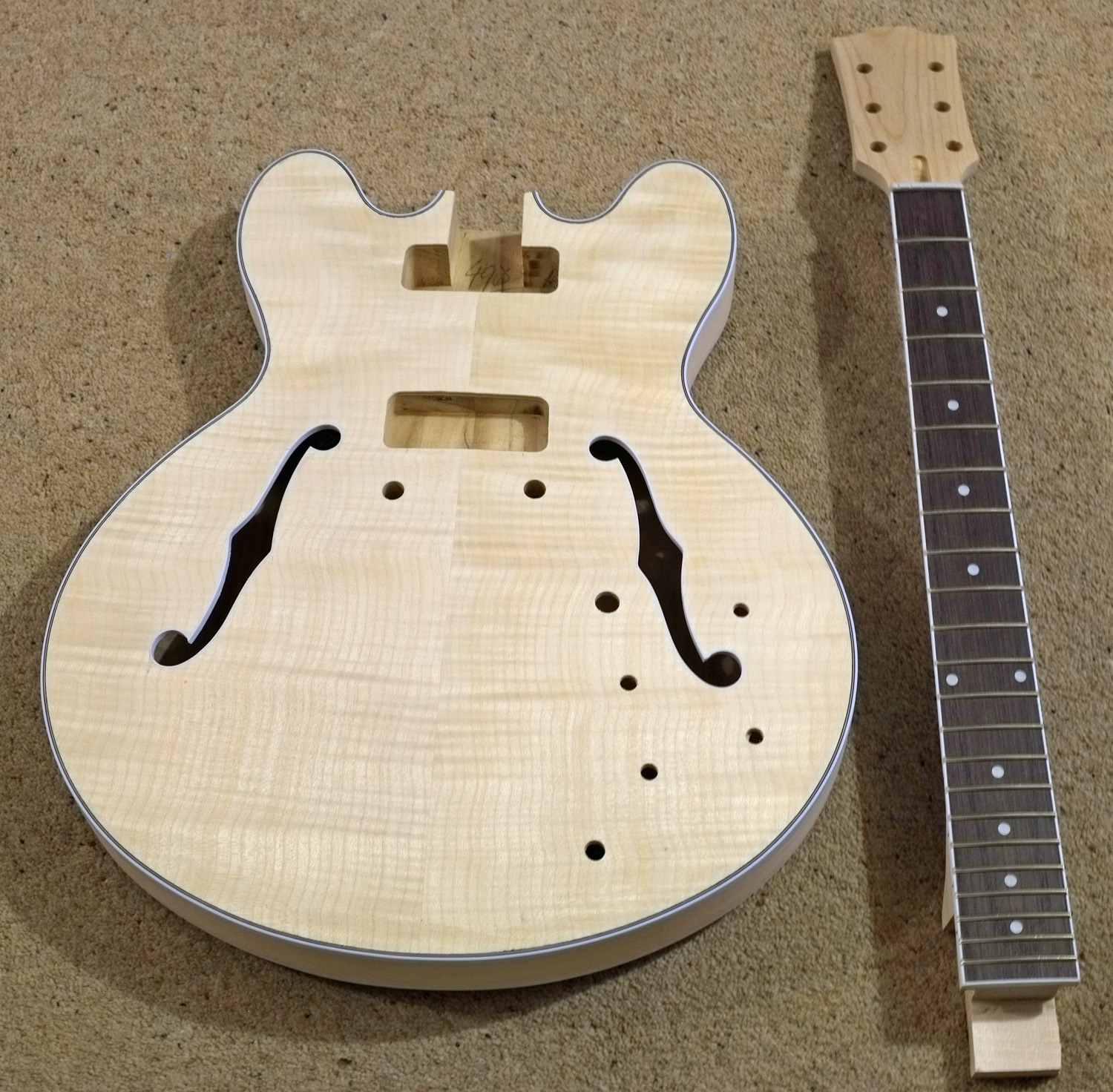 Well, this custom kit was ordered at the end of July and has finally arrived today. It's an ES-1 kit with a few simple modifications. I know that the ES-1 bodies are light, a lot lighter than the equivalent Gibson would be, so feels more like an ES-330 in weight. So it's routed for P-90s and only has bridge bushing holes drilled so I can fit a trapeze tailpiece in order to create a 330-alike. I did ask for a plain white binding on the top, which it didn't come with, but I can live with the standard striped binding.