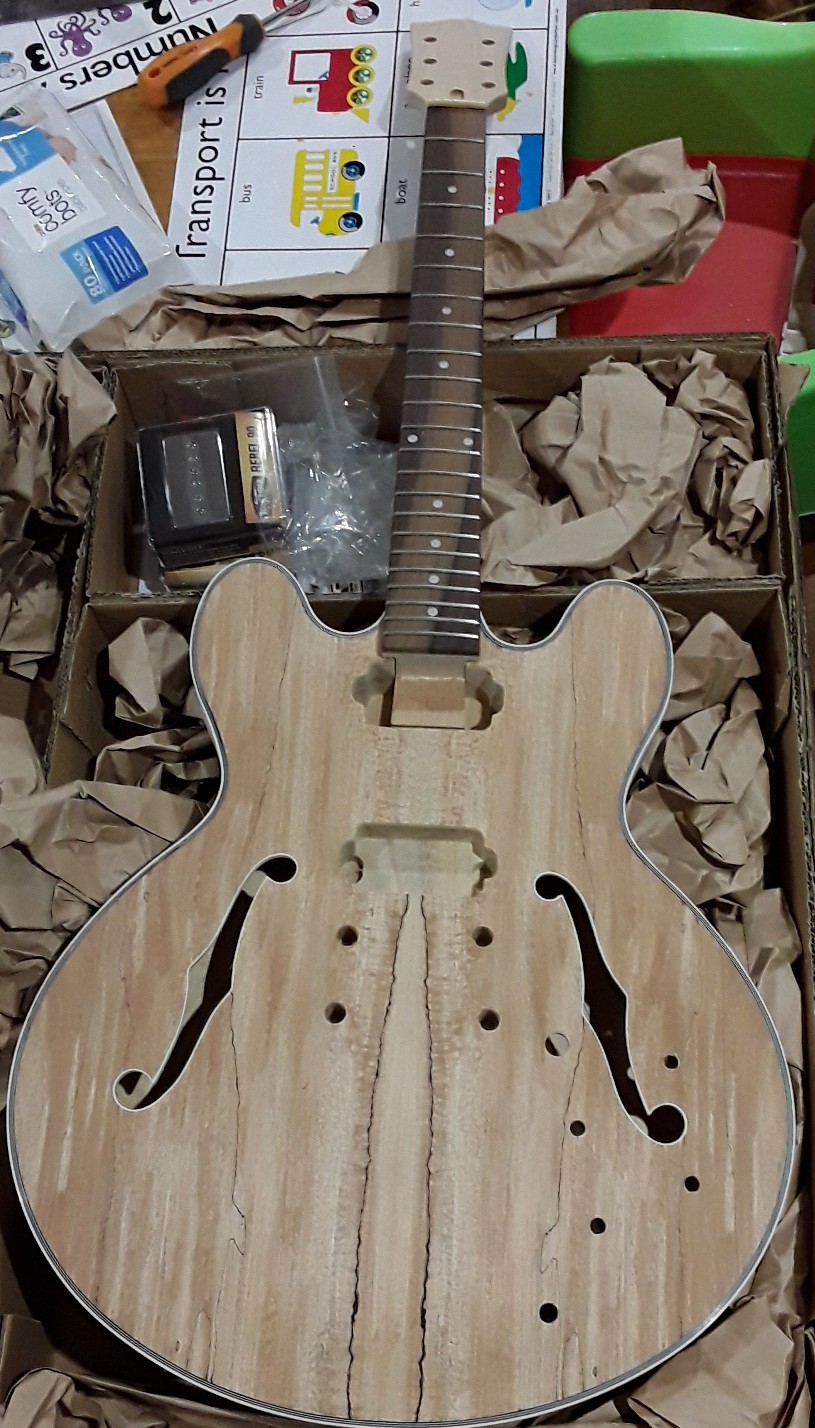 12 months ago a friend cameover and showed me the pitbull website and said we should build a guitar each. That was the start of something that has become somewhere between a hobby and an obsession. In a year ive built an es1tl, es2v, gr1sf and im finishing of the rc1m, 4 guitars in a year? I was out of t/o and needed some more to finish and couldnt help myself so I've ended up with this turning up today with the t/o, Attachment 24841 got some tonerider rebel p90s with it since i dont have any single coil guitars, i was going to mix some bondi blue and black stump to get a smokey blue Attachment 24842 like this but the spalted top looks so good i don't know if i want to stain it or not. Its maple veneer looks amazing as it is