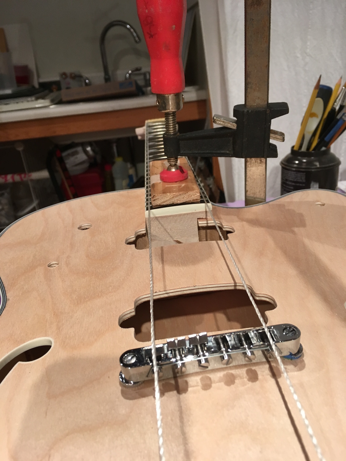 Put masking tape right along the edge of the pocket, so that if any glue does squeeze out when you clamp it, it doesn't go on the top. Wipe the excess glue off wherever you see it, but it's best to avoid getting any on the top or sides where it may affect the ability of the wood to absorb stain or other finish.