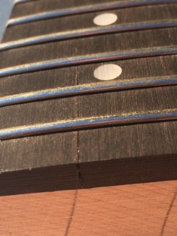 However, after staining the neck (with colourless dingo) and coming back to it, I have noticed a crack in the base of the neck (just in the fretboard, not the actual neck) extending up frets.