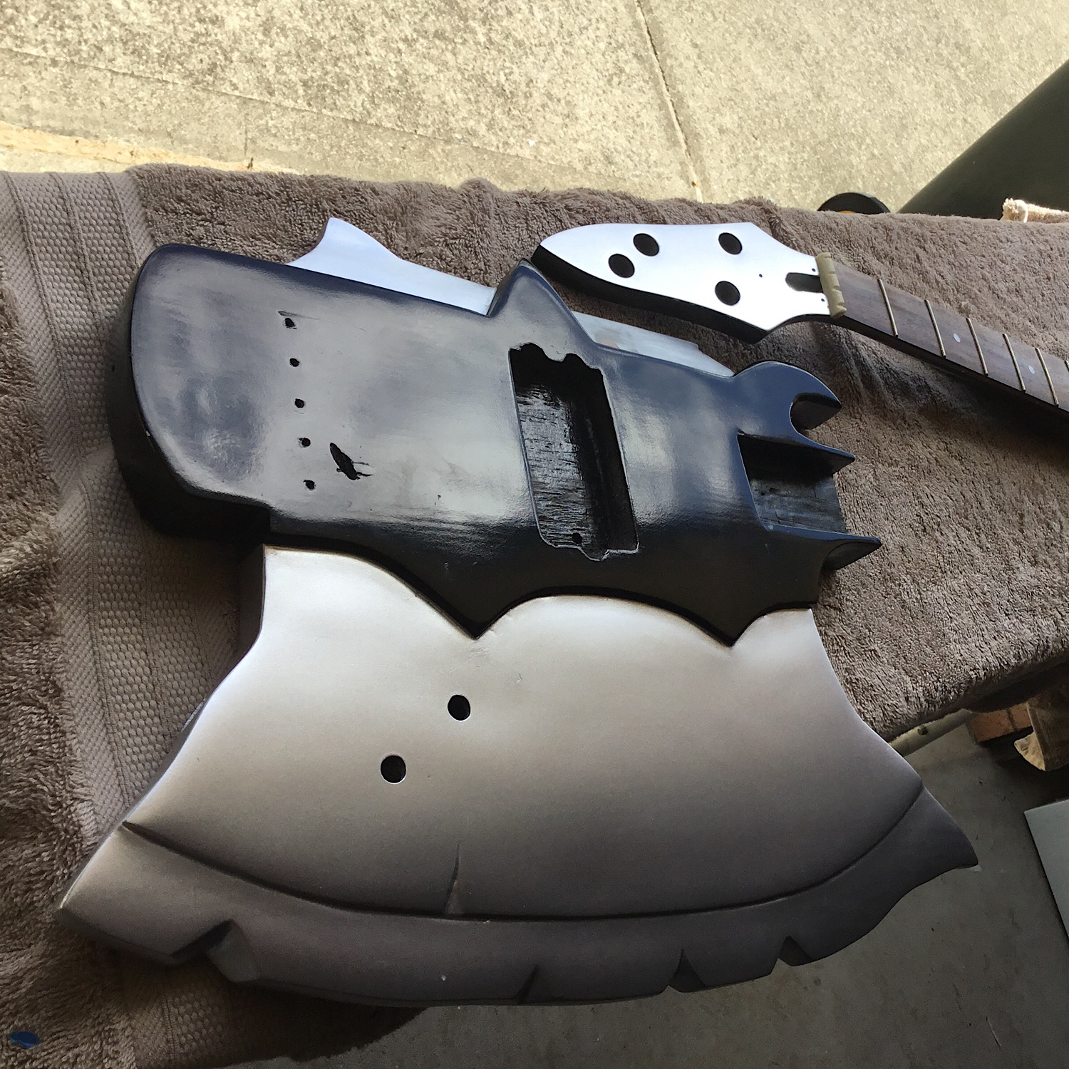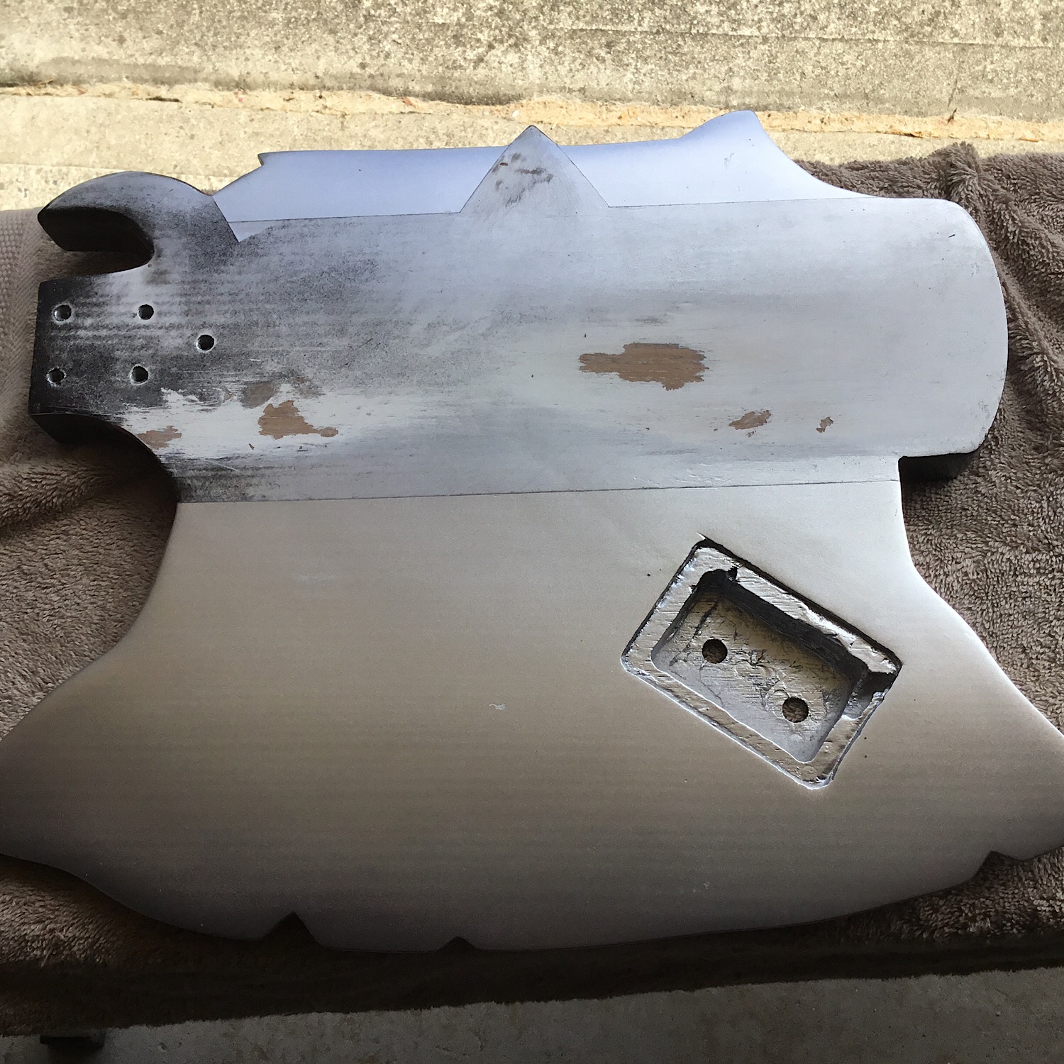 Originally it was painted with some rattle cans and having no experience at the time painting,it was pretty bad. All I had left was the body as the neck was badly split and all the hardware was really rusty. I bought a second hand “Musicman” bass from the junk shop for 40 bucks, as it had a cracked neck at the joint I glued and clamped ,good as new. I am reusing all the hardware as well ,so out comes the router for the larger pick-up. The doner guitar was green and with that crappy headstock shape it had to change, it looked like “Gumbie’s” head. It’s got a real nice grainpattern on the fret board.