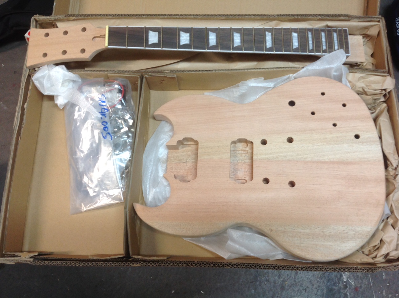 The kit arrived in February, but was popped on the shelf as I was busy dreaming up the Strat/Tele hybrid I'm currently playing with. However, I'm in that no mans land at the moment waiting for the poly to dry on the tele kit, so I thought I might get the next one out to have a look at.