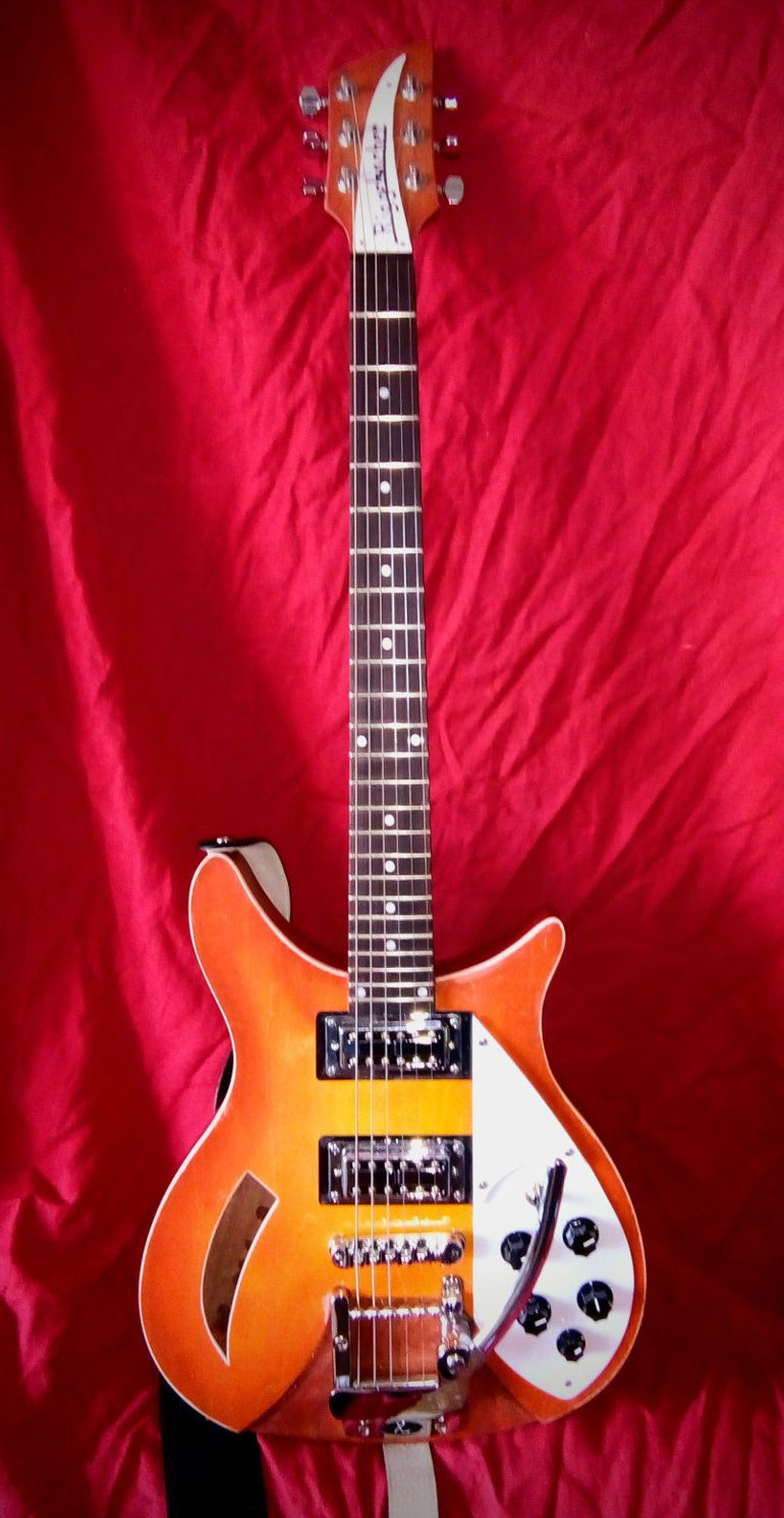 Grover tuners, aftermarket knobs, and chrome accessories, and Warman pickups.