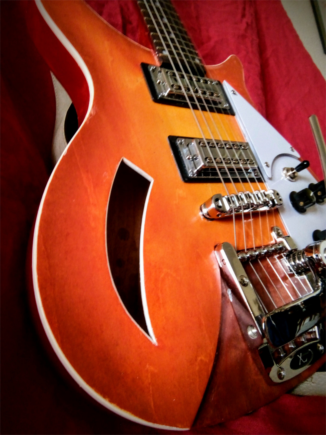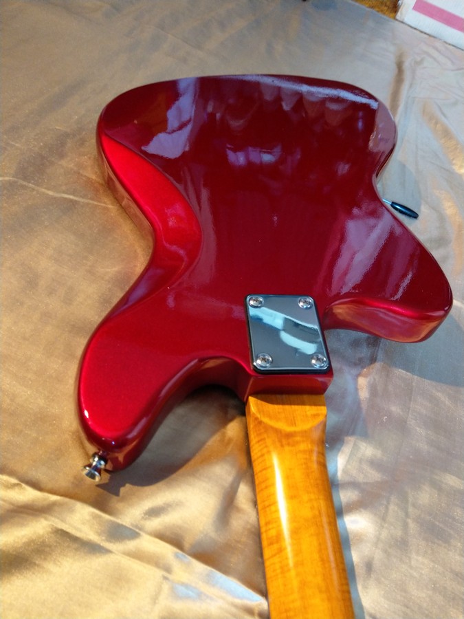 The body and headstock are finished in candy apple red with a 2k clear over the top. It has 4 primers, 3 silver basecoats, 3 cherry apple red coats, 2 clear coats, then 2 more cherry apple red coats finished with 4 coats of clear.