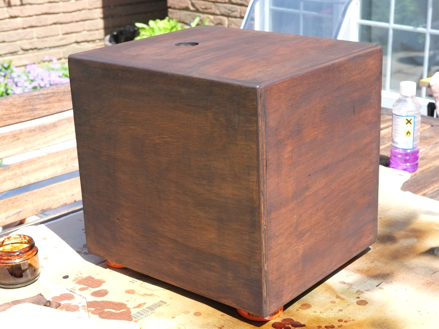 It was made out of Meranti-faced ply, so I started off finishing it using a dark-brown tinted varnish, followed by clear varnish over the top (both water-based from the same manufacturer). I built up several layers of each, to give me enough depth to sand flat and polish after leaving it for several weeks to cure.