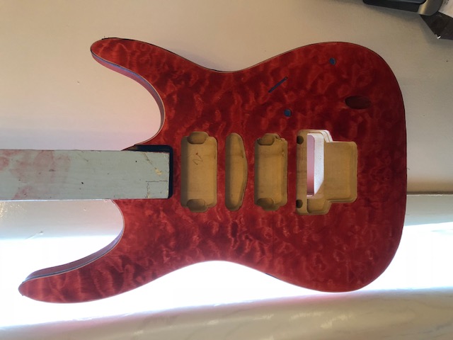 If so, just keep adding more base stain however if you mean a different colour shade darker, welcome to the unpredictable game we are addicted to called kit building. Rarely does a colour scheme in theory end up the same in reality as the timber used will dictate a lot towards final outcome. Your headstock looks more orange than red which could be lighting in that shot, but if it is a different shade or colour it will need more coats than the body to even things up a bit.