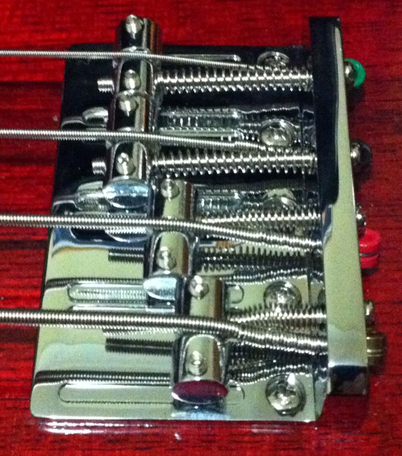As mentioned under general Bridges thread the standard F style Bass Bridge that comes with kits has quite a small footprint which does not provide much room for getting correct intonation. I discovered this by swapping up from a set of light strings to a slightly thicker gauge and ran out of forward bridge saddle movement on the G string and possibly rear movement on the low E too.