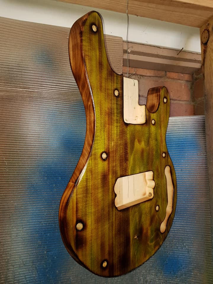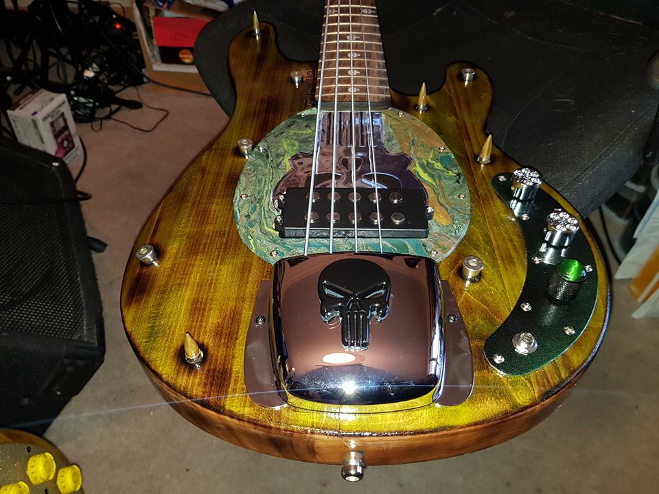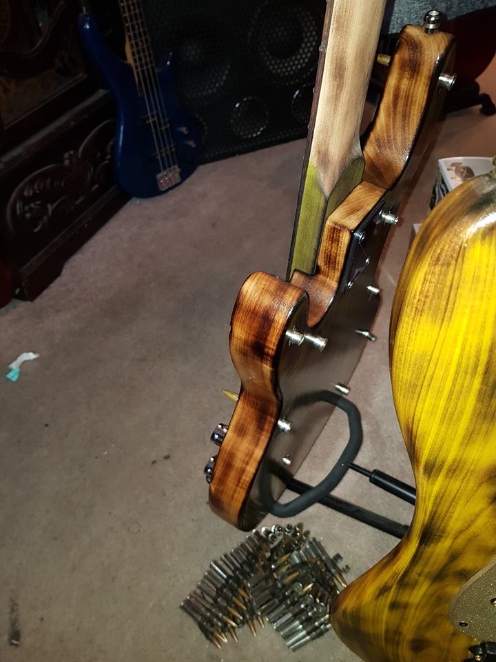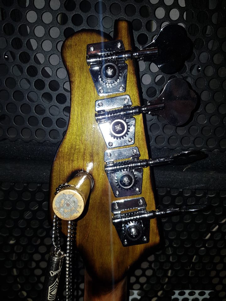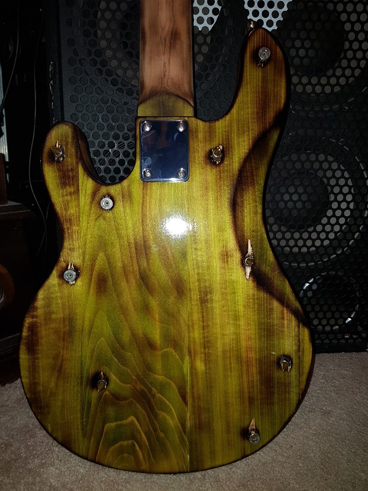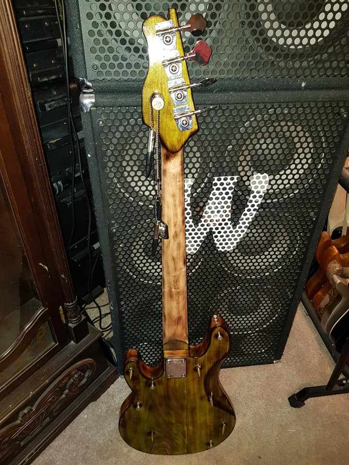One of my fave Bass builds to date...A Shou Sugi Ban, olive stained MM5(4) String Punisher Bass with actual 303 Winchester's thru the body and a .50 Browning thru the headstock.