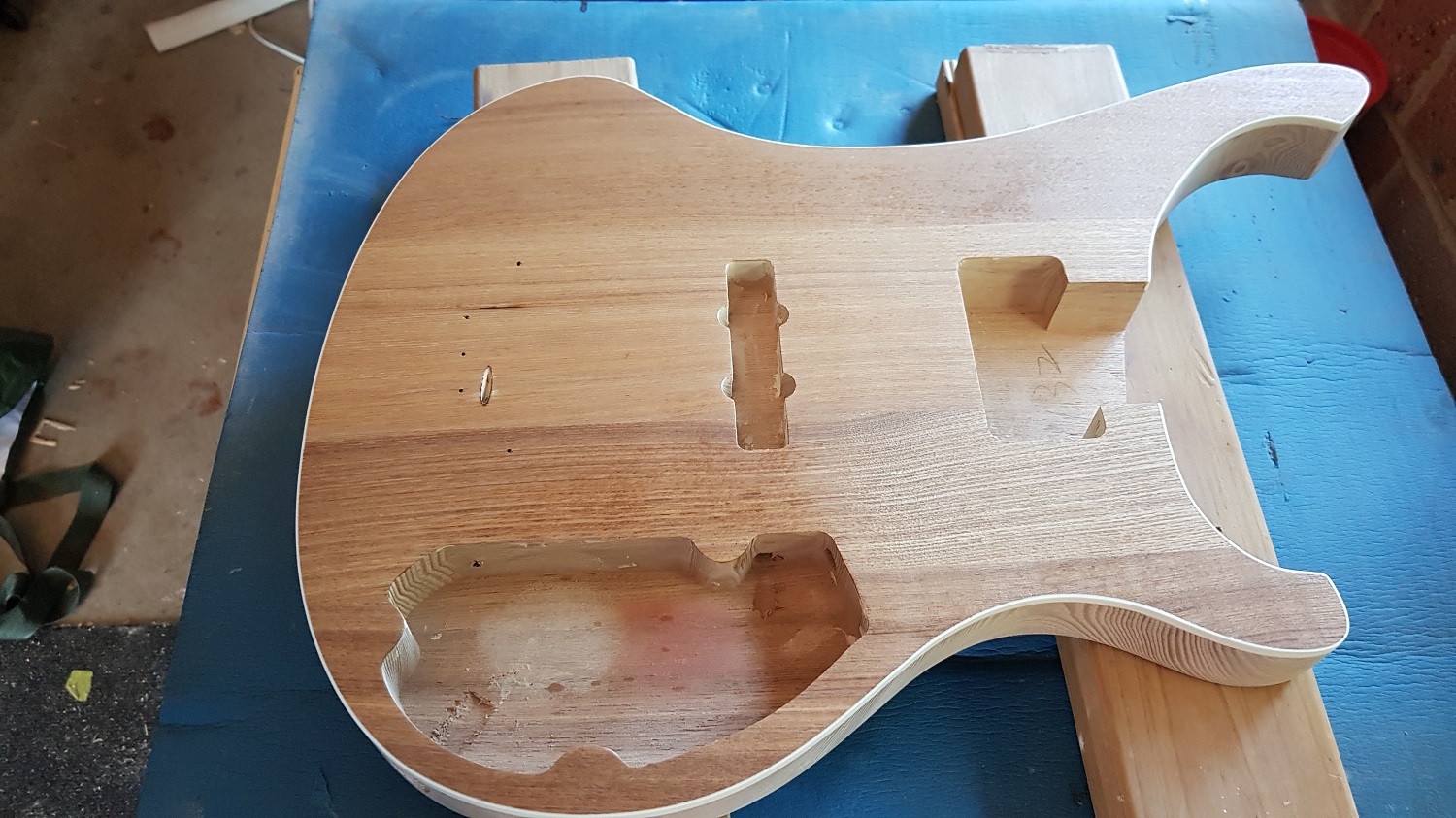 Sanded, grain filled, bridge positioned and first coat of oil.