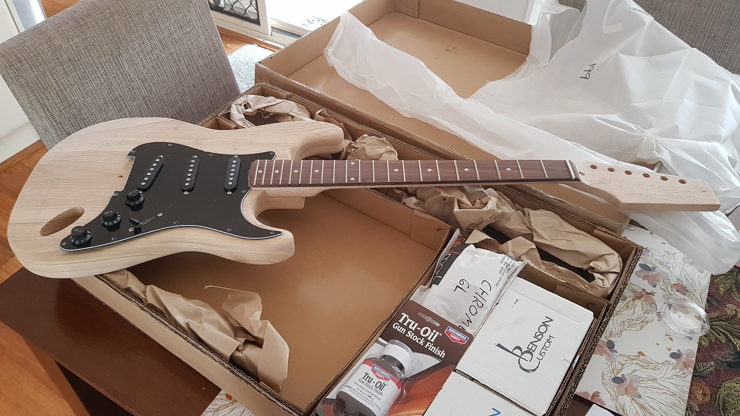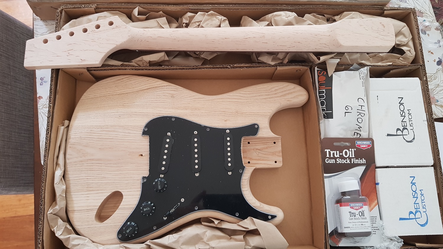 Shout out to Adam, for fulfilling my request to swap out all the white bits for black bits, and yes there are only 2 pickups in the box, 1 is on back order, they are Benson KWS's.