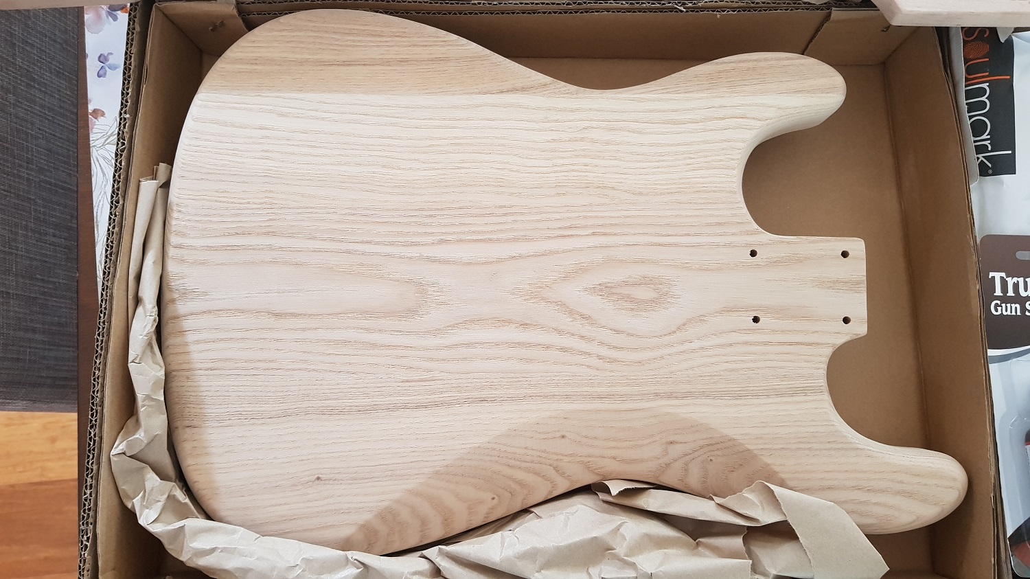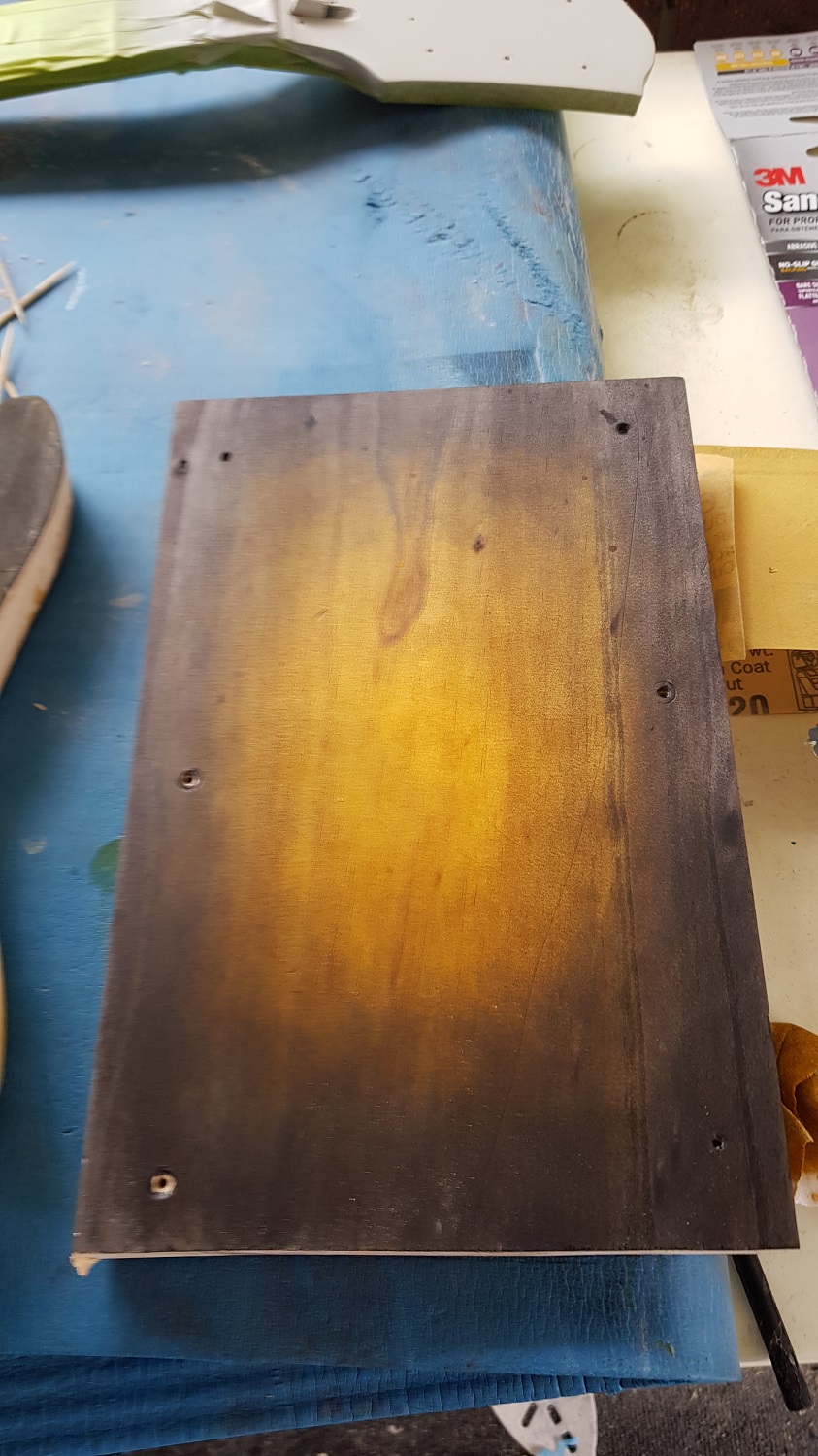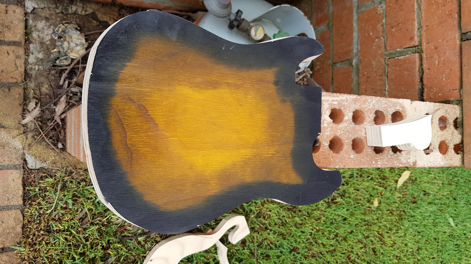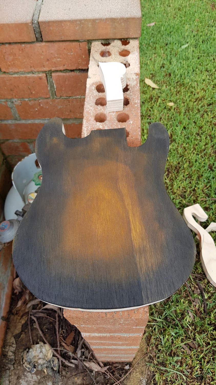 Current plan for this one is the classic Strat burst amber out to black, if I can get it right on a few practice pieces. If I chicken out, will probably end up natural, which with the grain will look fine as well.