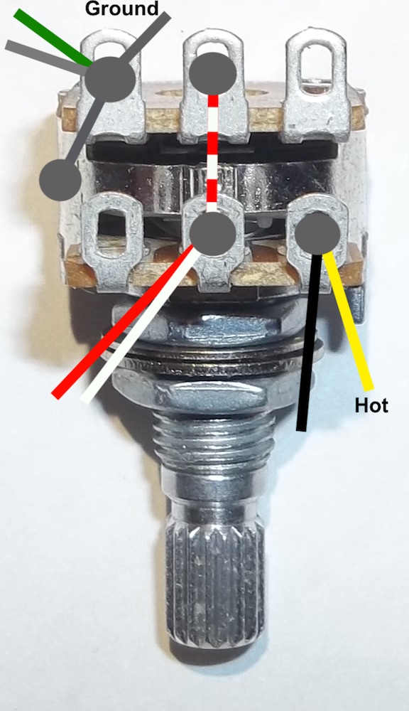 So my thinking is that Green will always go to ground, and on the top pot the wiper blends between ground and the hot output of the south coil (red), then feeds that on to the north coil (white). On the bottom pot, I have the hot output (yellow) from the wiper panning between the output of the north coil and the output of the south coil. It seems okay to me, but I'm wondering if there's an issue in wiring the south coil output to both pots. I can live with a bit of weirdness in the blend between the black and red on the bottom pot, as long as it behaves properly at both extents of the taper.