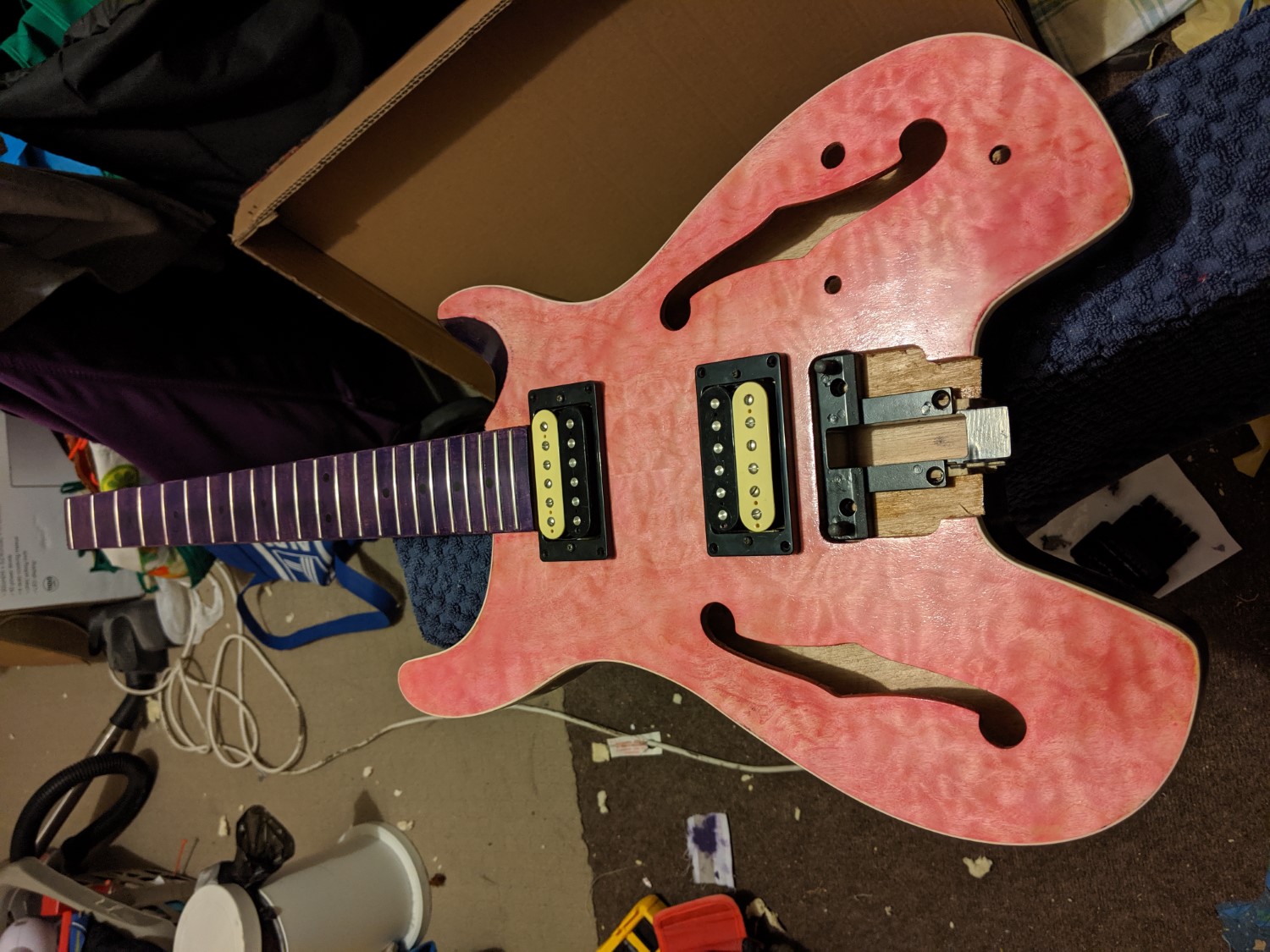 Body work was pretty decent. Lot of the routs on the top have little shavings hanging off them, a "freshly routed but not cleaned up yet" sort of feeling. Feels solid, and some decent thickness on the neck, which I always appreciate personally.