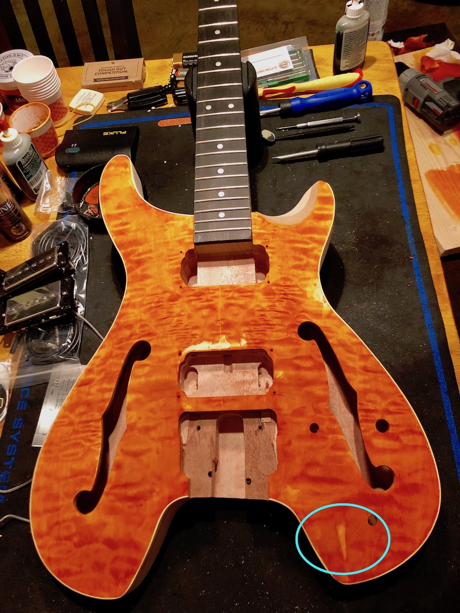 I love the look of this guitar. The quilted maple top has a few flaws in it - one sizable one, in fact - but I'm going to use it as a means of learning how to work with them.