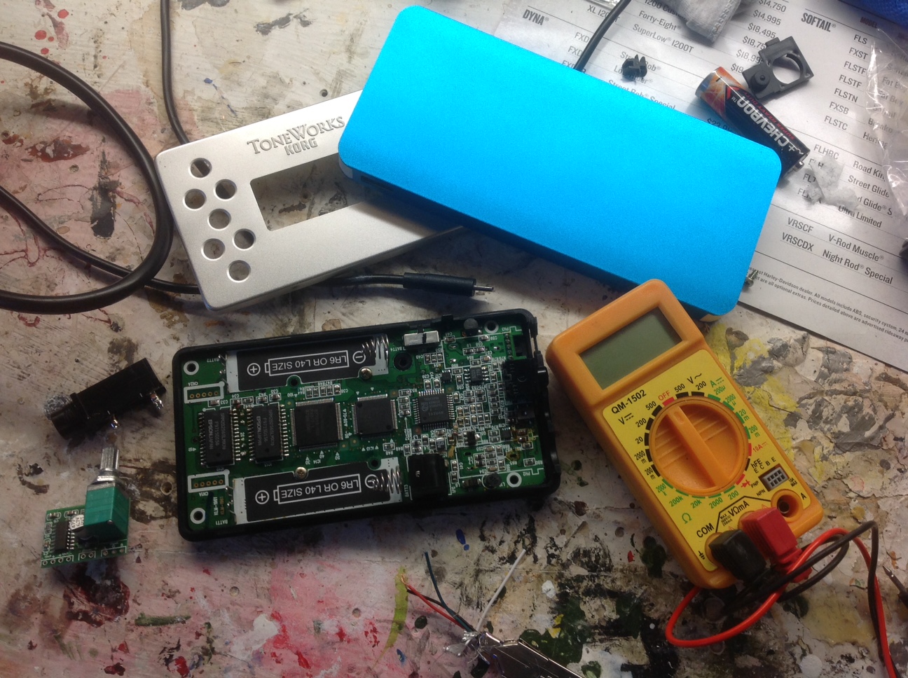 This is what I've started with, a broken Korg Pandora PX 2, a digital 6w 5v amp and a phone battery backup. 6w doesn't sound like much, but these digital amps are extraordinarily efficient so it should have some legs.