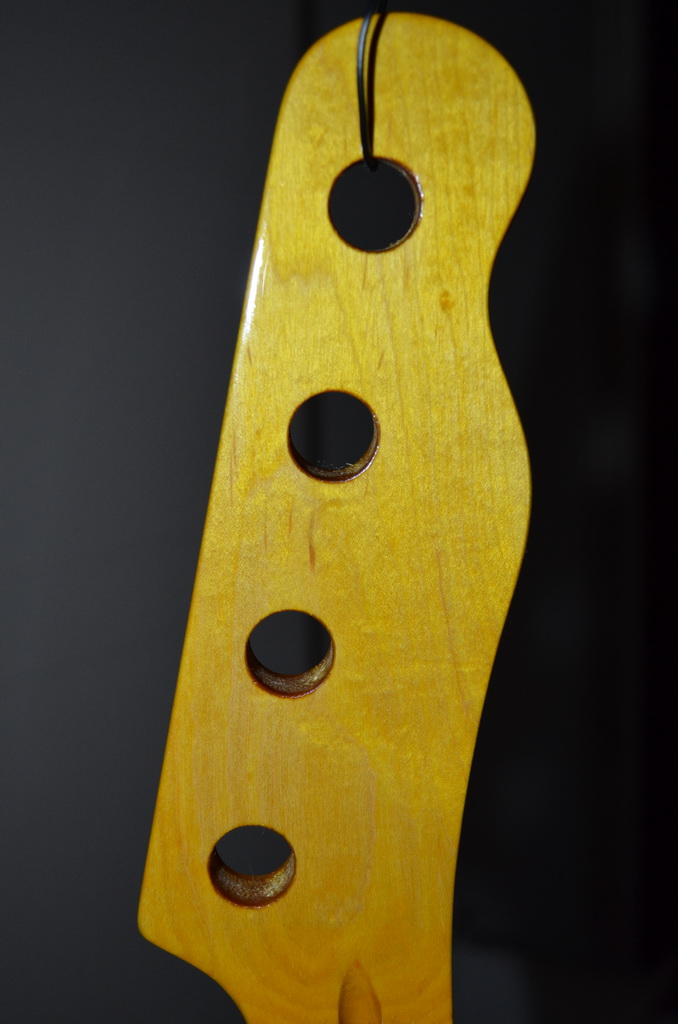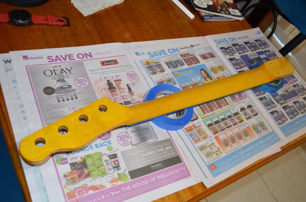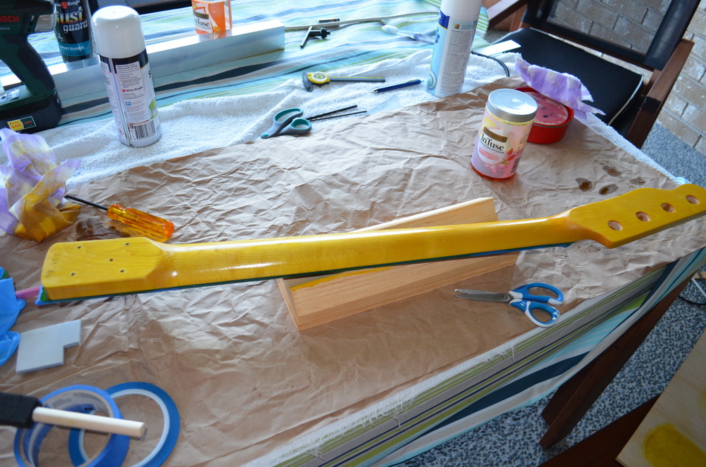 So in January this year I finally got around to attempting to apply a finish to my custom-order Pitbull bass neck (with Tele-style headstock) that I've had since December '17. I'd shaped the heel soon after it arrived and then sat there for about a year. In that time I ordered some tung oil and citric turpene from The Woodworks in Sydney along with some yellow dye to make a vintage yellow.