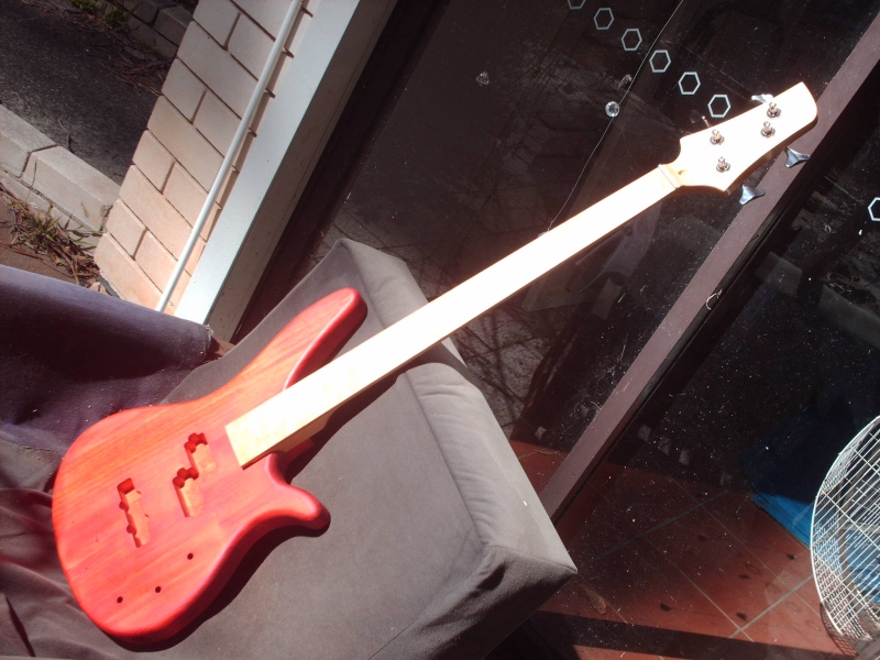 The nut appears to be the correct height for frets i.e. much too high for fretless. So it will need its slots deepened. I ordered a bone nut, but received a six string one, I'll have another look at it in case it can be adapted easily. The neck, finished only with Tung Oil, feels great.