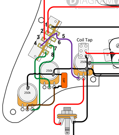 Also, the above diagram has a standard Strat-style tone layout of: Tone 1 (closest to volume) for the Neck pup, Tone 2 for the Middle, and no tone control for the Bridge. As such, the cap will only apply to the single coils or the Bridge+Middle combo.