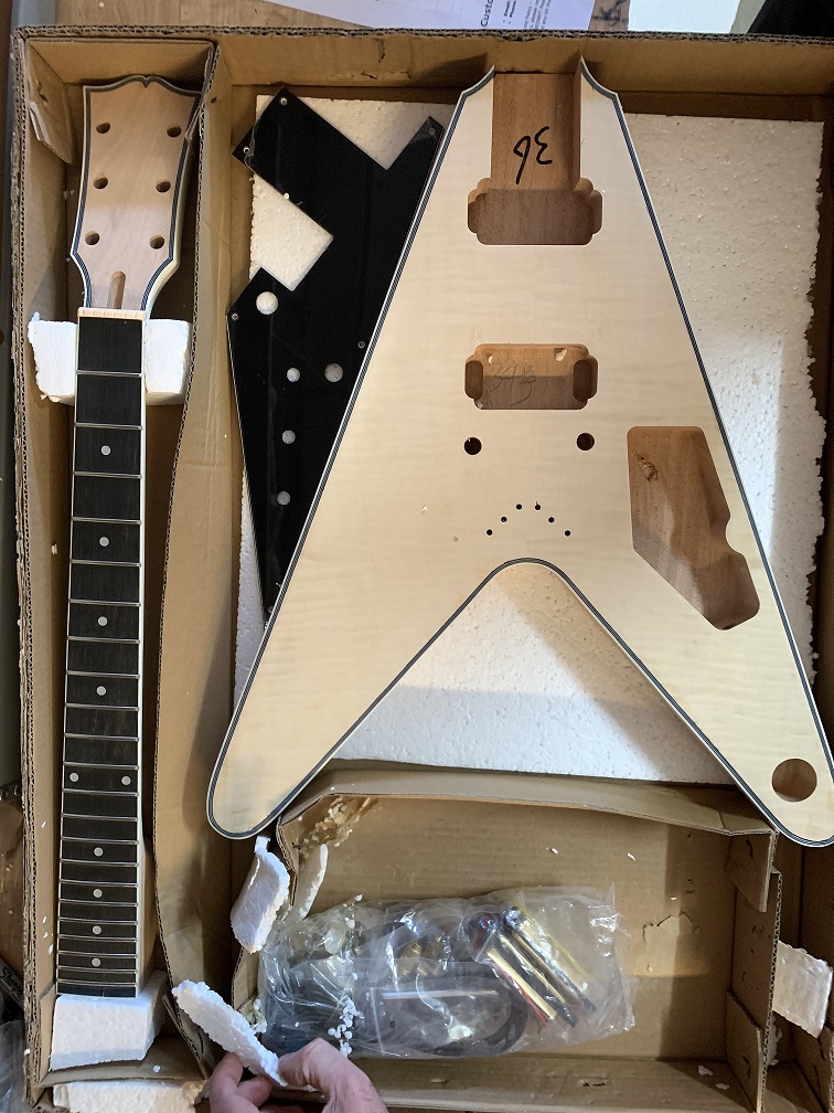So, after much deliberating I decided to do this custom kit here with pitbull. It is not much different than the FV 1 G kit. The differences are, mahogany body and neck, dots no blocks, set neck, LP headstock, and finally ferrules rather than V plate. I didn't want the veneer, but somehow I failed to specify this specifically and got it anyway. Sadly, it is blistering already perhaps due to the tropics. Has anyone ever successfully removed the veneer? If so, I would love to know how it was done. Otherwise I am over the moon. See me go!
