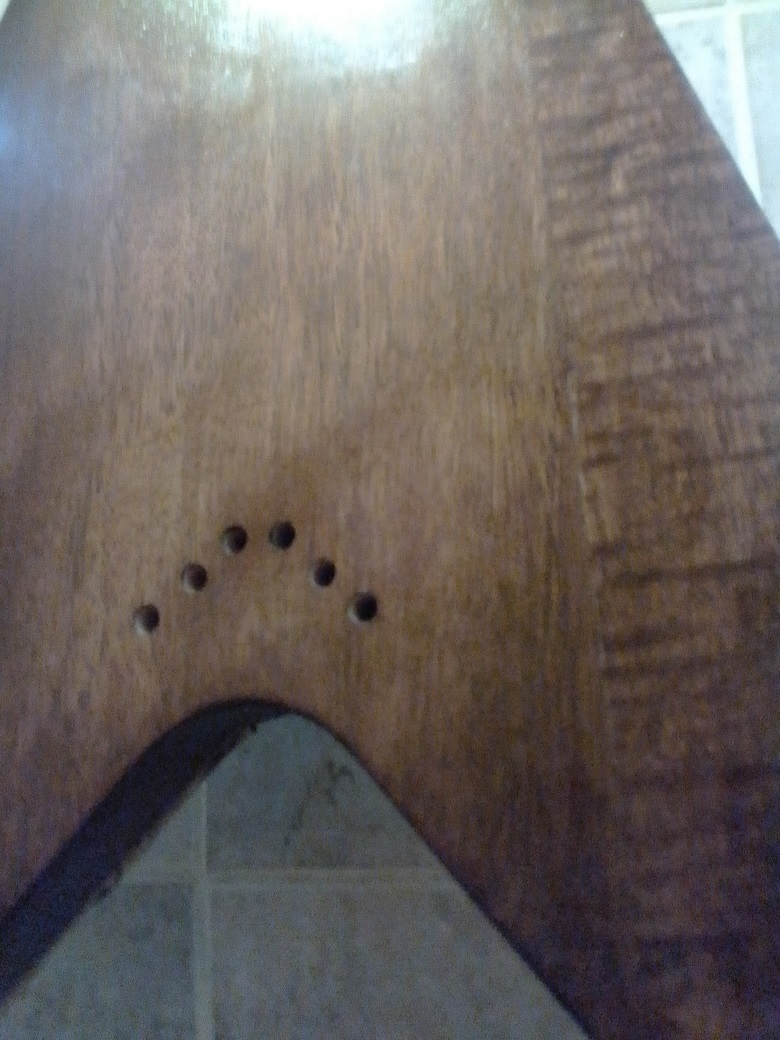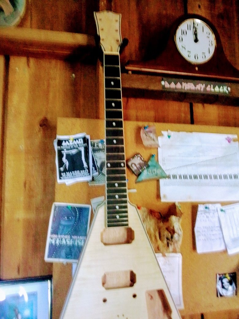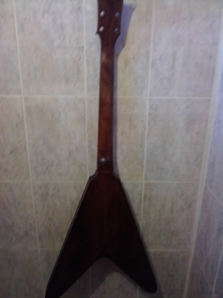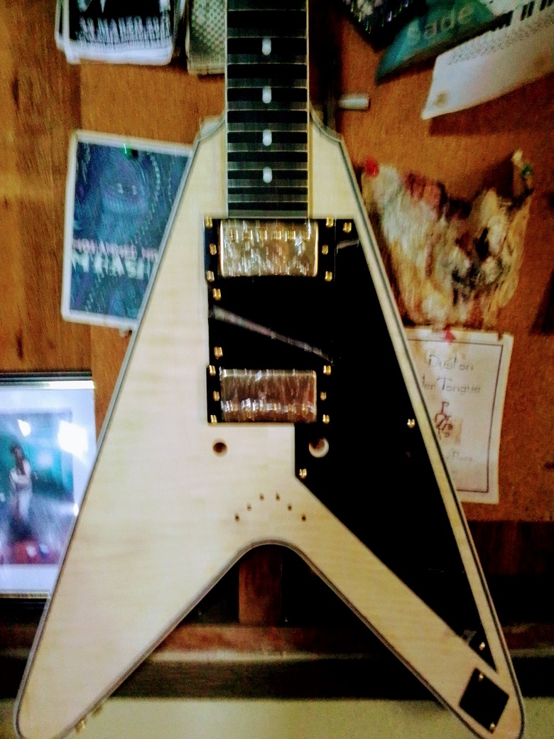 My first real guitar was a harmony flying V. A couple summers later, I had traded it to big chief's pawnshop for some other guitar that I thought looked cooler. Since then, really, I have had this nagging desire to have a V again. I even tried a couple of times to buy a harmony just like I had, but I finally decided to build one. I always thought that Albert King's flying V with the LP headstock looked pretty sweet too, so I would start there. Obviously not the same woods, but just the unique look. Aside from King, I cant think of any such Vs. Attachment 32871