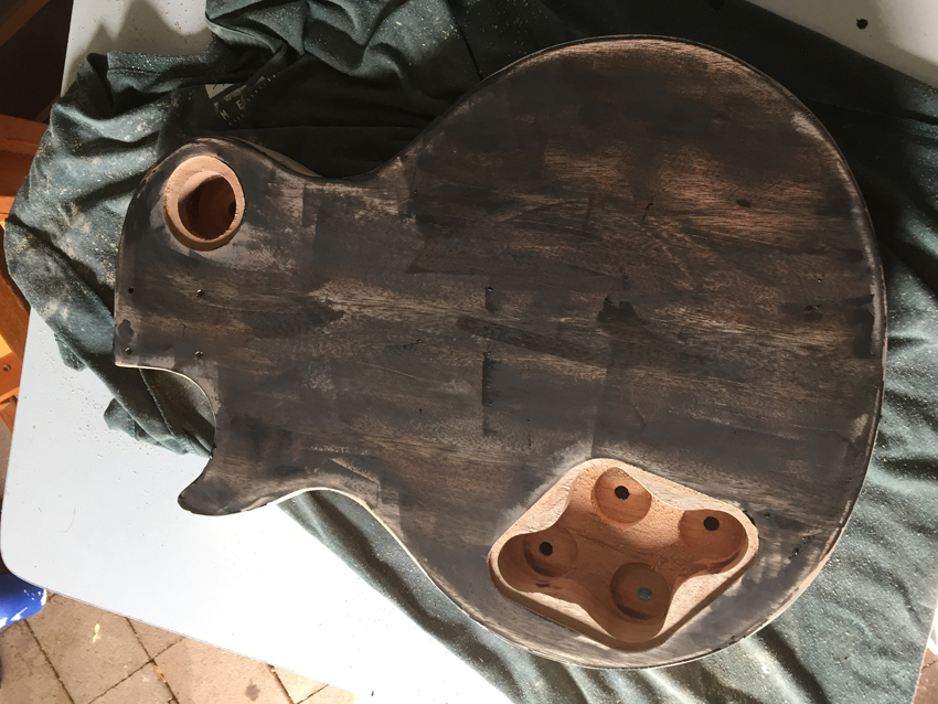The staining process has been fun. I stained the body with Colortone black after sanding to 320, and then I've been sanding the body in the same way as I did the front - a couple of thick layers of tru-oil over a few days, then wet sanded with tru-oil and increasingly fine grades of sandpaper. It's coming along well - currently on 600 grit. I added some Colortone black to the tru-oil just in case I accidentally sanded through anywhere, and it seems to be working really well.