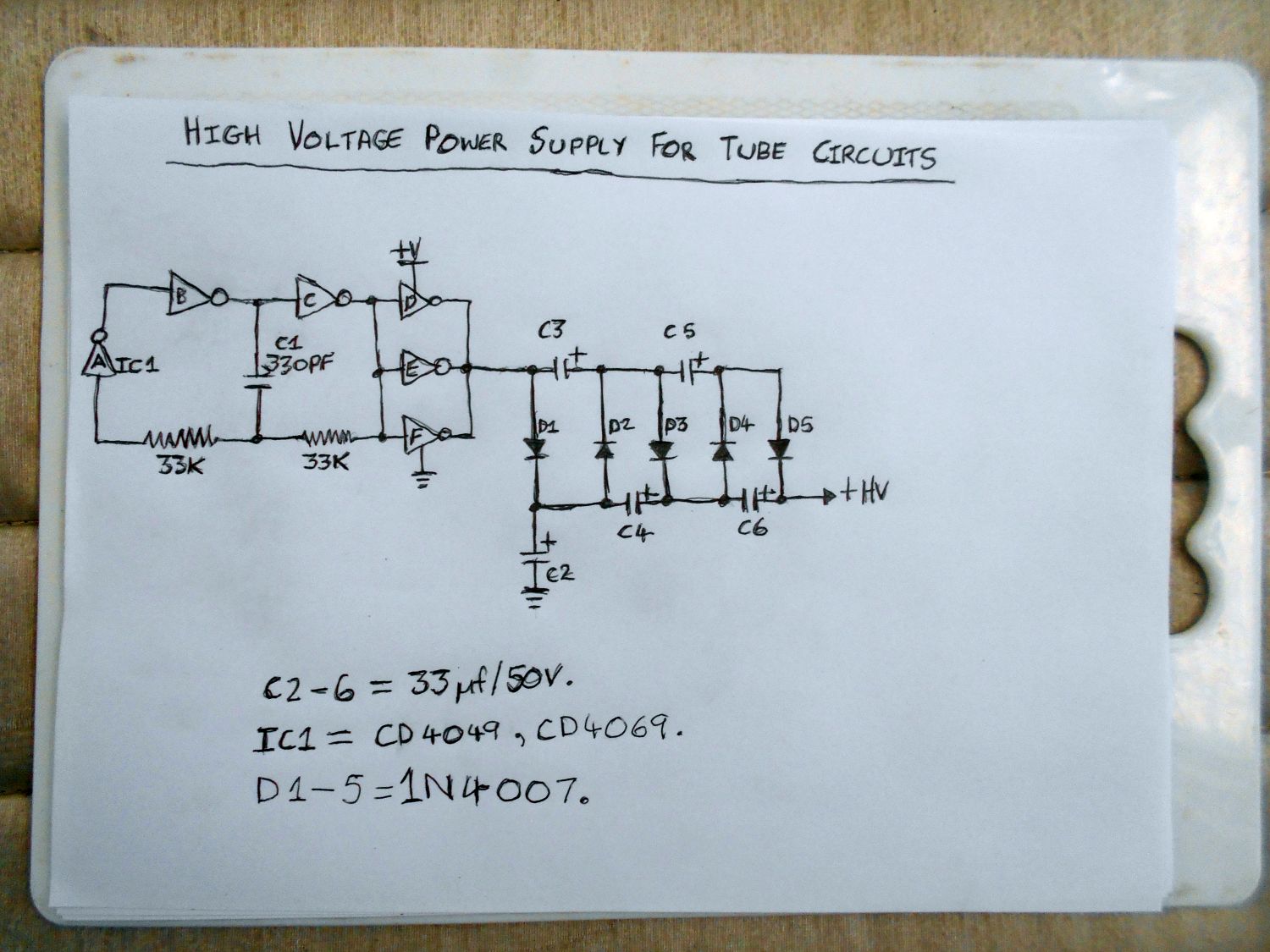 The only caveat with this circuit is that the working voltage of each of the 33uF caps needs to be at least 50V DC or greater, 33uF/63V caps should work fine, I've used some 1uF/100V caps in the circuit instead of 33uF/50V and they worked fine.