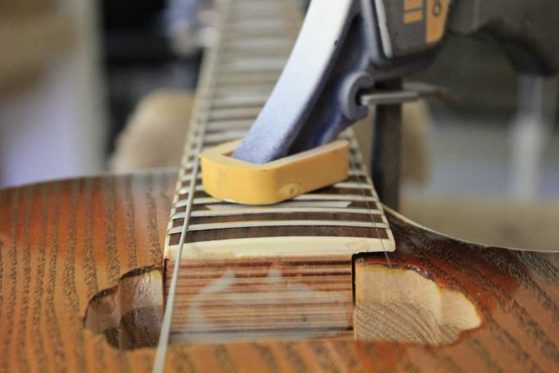 Today I leveled the frets, re-crowned and got the neck glued. Fingers crossed I did everything right with the neck - It looks fine but in the back of my mind a little voice is telling me I didn't use enough glue. I had all the surfaces covered, but there wasn't much squeeze out. Oh well, time will tell!