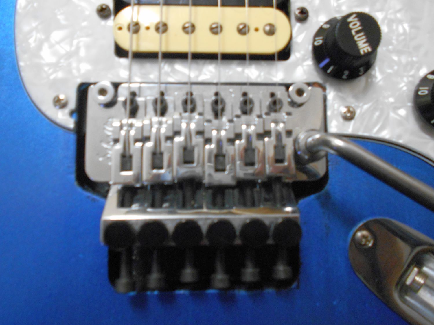Here's a pic of where I have the string saddles positioned on the HotRod Strat's bridge, as you can see, the saddle for the low E-String is set pretty much close to it's limit for lengthening the string, and it still reads a bit sharp: