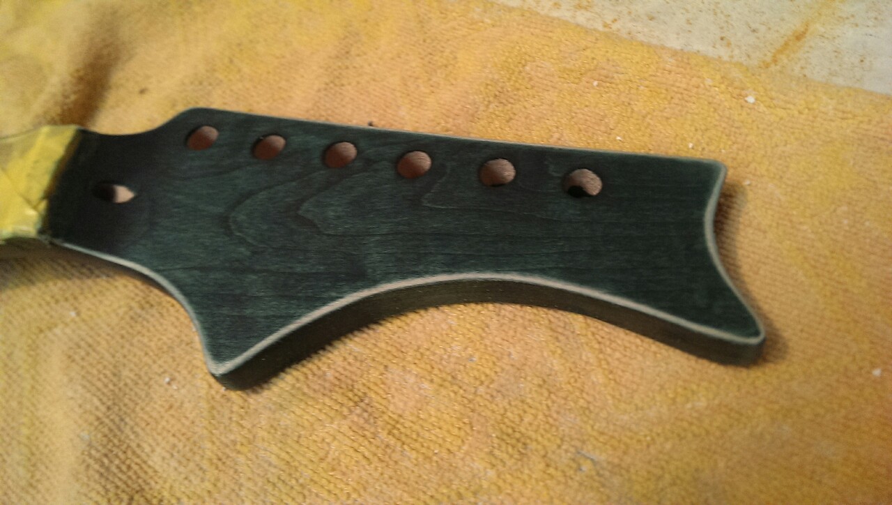 Wasnt happy with the stain on the headstock so resanded again,twice already, restained but sanded back the edges to give it a striped edge look.