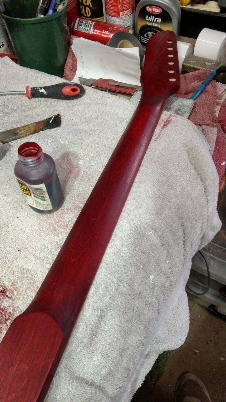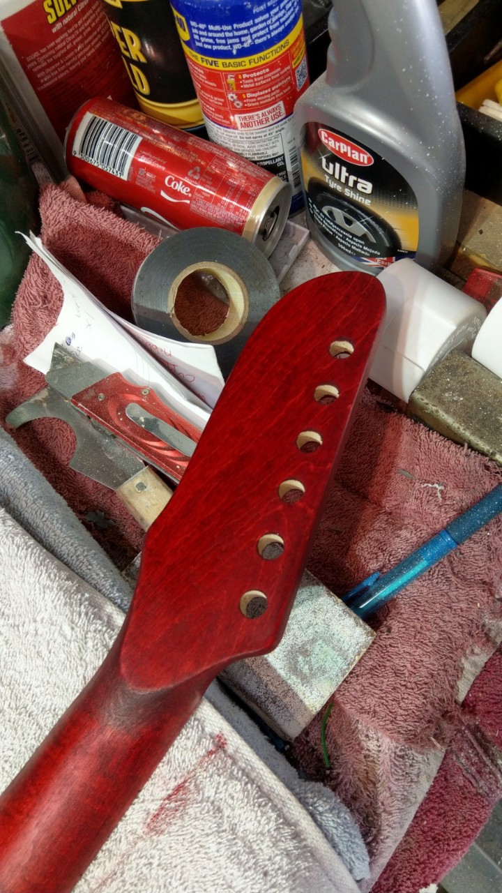 So while i was waiting for the body filler to dry i looked for my pots of stain for black which i had decided to stain the fretboard with and came upon RED MAHOGANY!