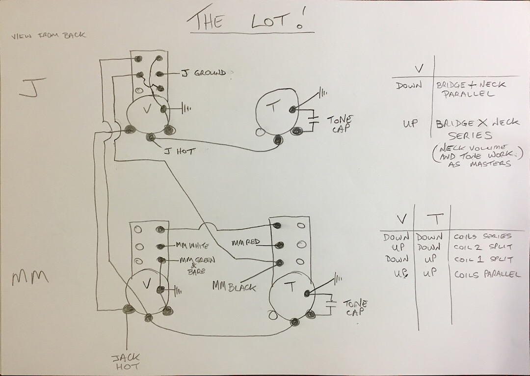 Remember that the J pup will be in phase with one of the MM coils and out of phase with the other, so when the OOP coil is in the mix there will be some cancellation of certain frequencies. Tweaking one of the volumes will help to reduce that effect.