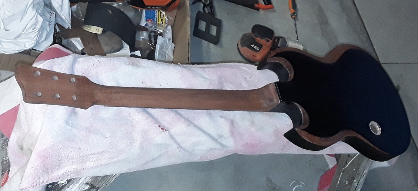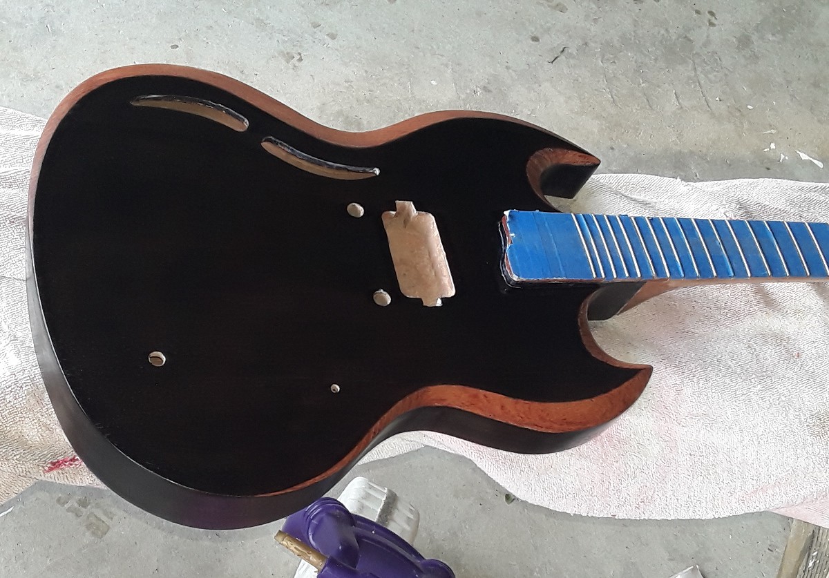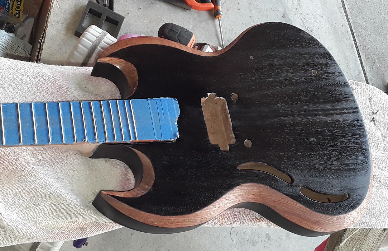 Thinking about it (with obvious hindsight), it might have been better to do the white first, then try and grain fill with black filler over the top. You may then have needed another white coat after sanding back. There are enough small pores in mahogany to show the grain pattern and make it look interesting (like a Gibson 'TV yellow' finish), but it hasn't got the cross-grain figuring that flame or quilted maple has to take up a darker colour for 'popping'.