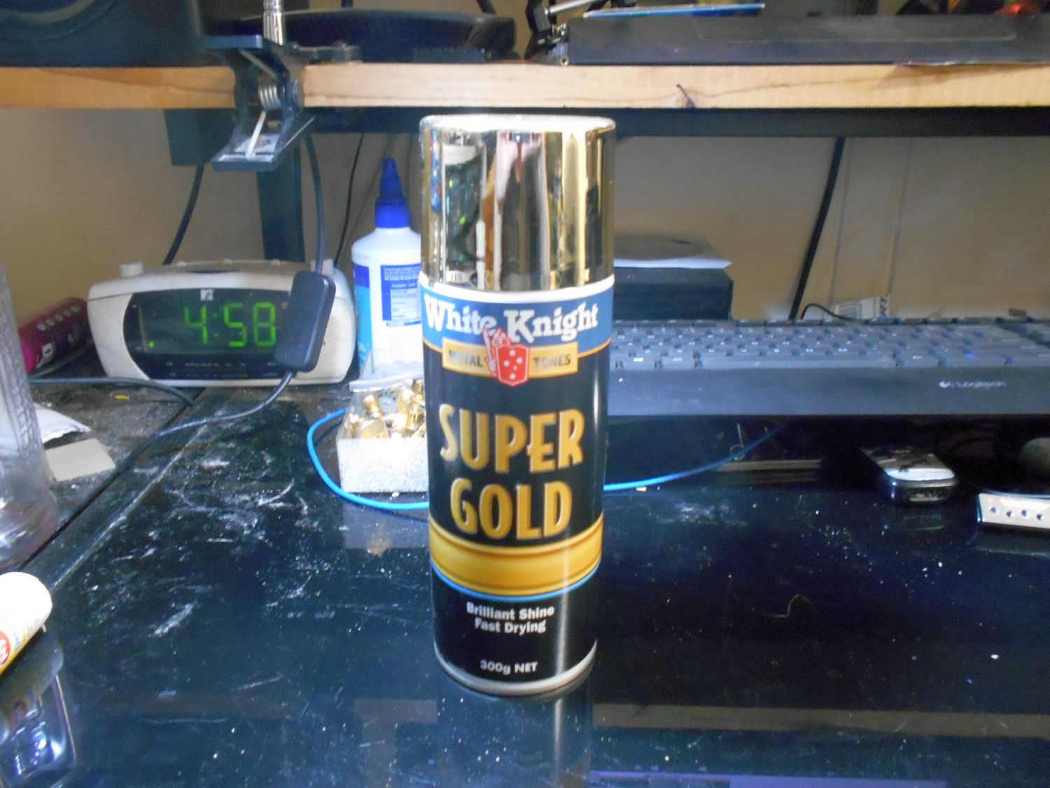 Here's a pic of the Gold Spray-paint can I'm going to be using, it's a very bright-gold colour, hopefully it should look cool with the White Pearloid Scratchplate: