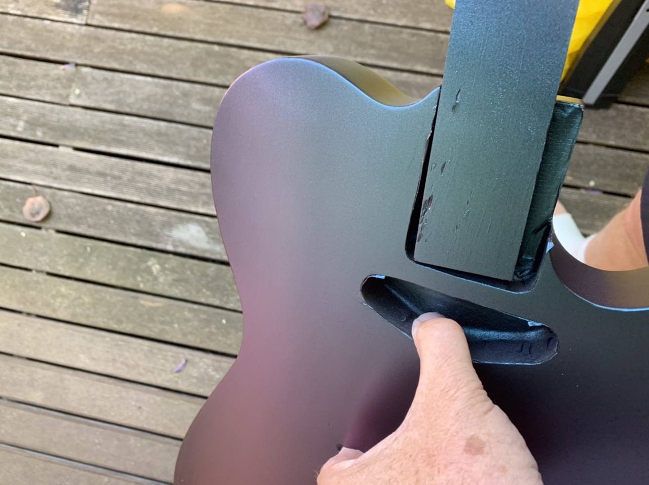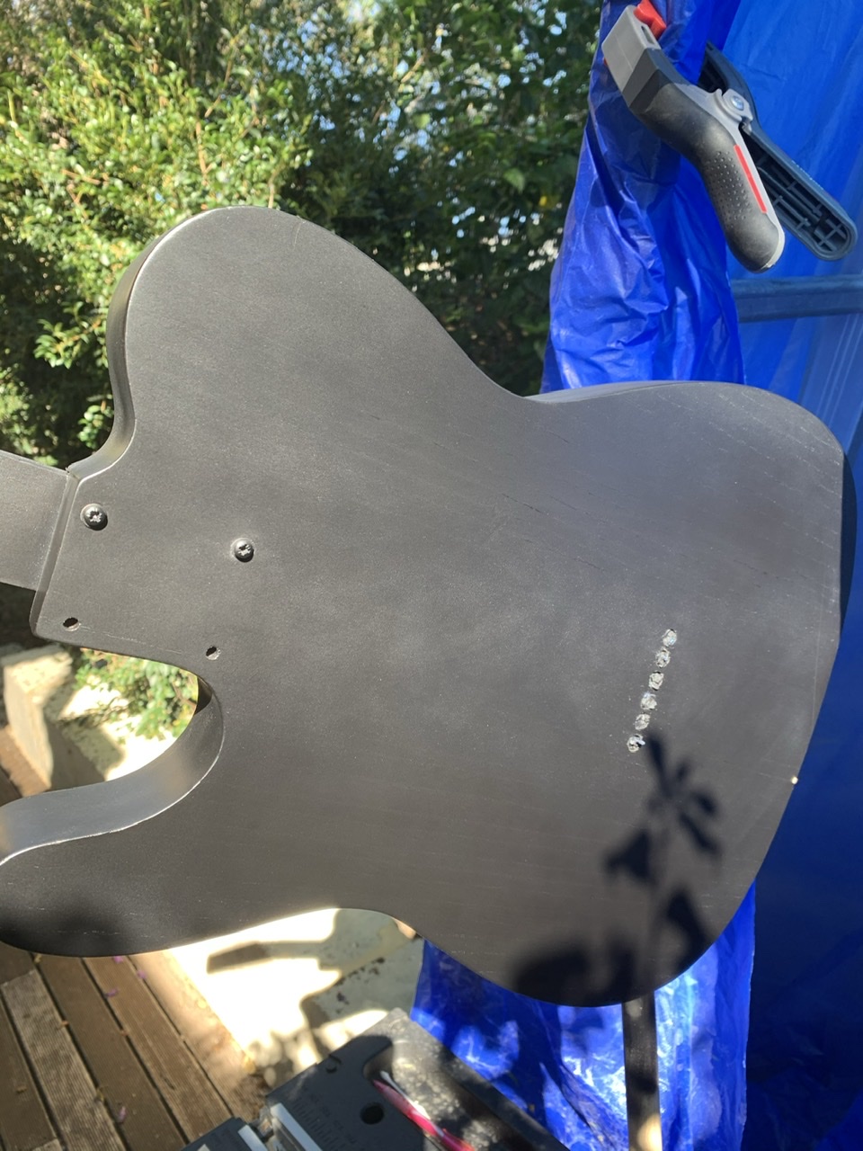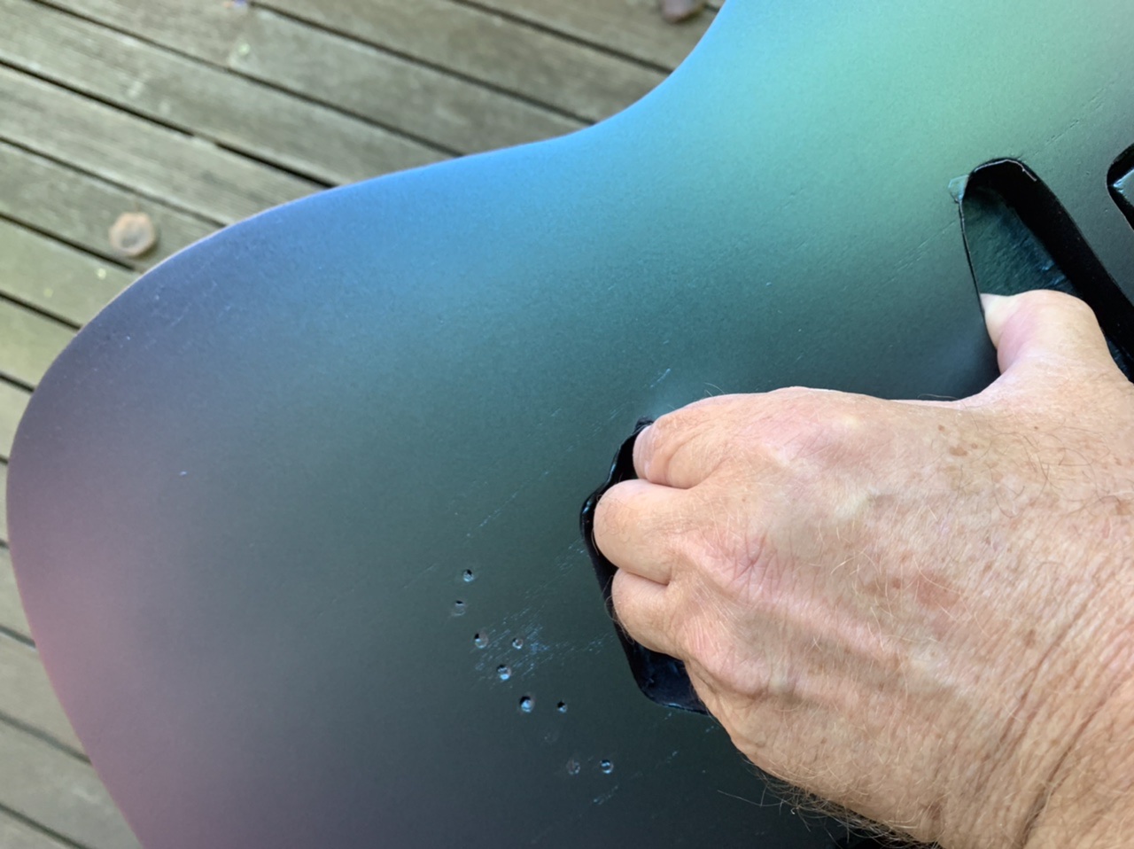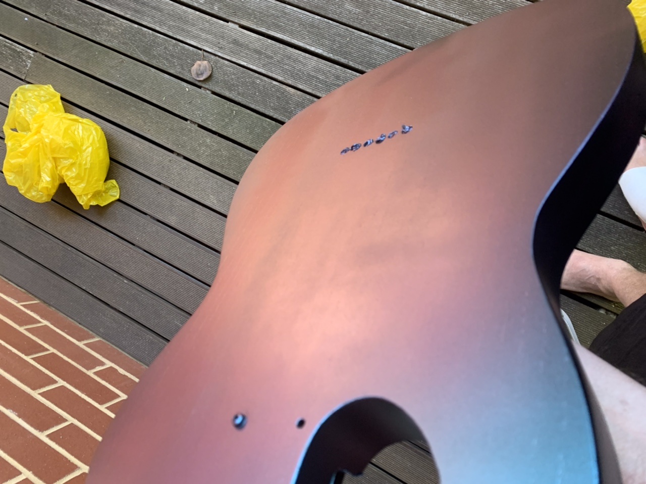 I decided to live with the grain and do the topcoat today. Those of you who have been playing along at home will remember I am doing a colourchange paint, a’ la silver sky nebula.