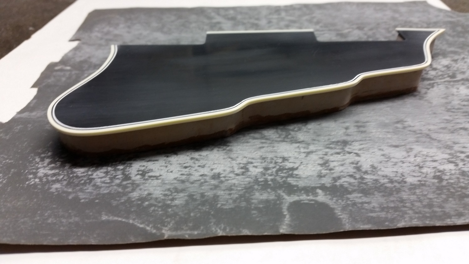 Made a pickguard from scratch. Drew up a shape, cut out a template from MDF and routed some 2mm acrylic to get the main part. Then glued on purfling and binding.