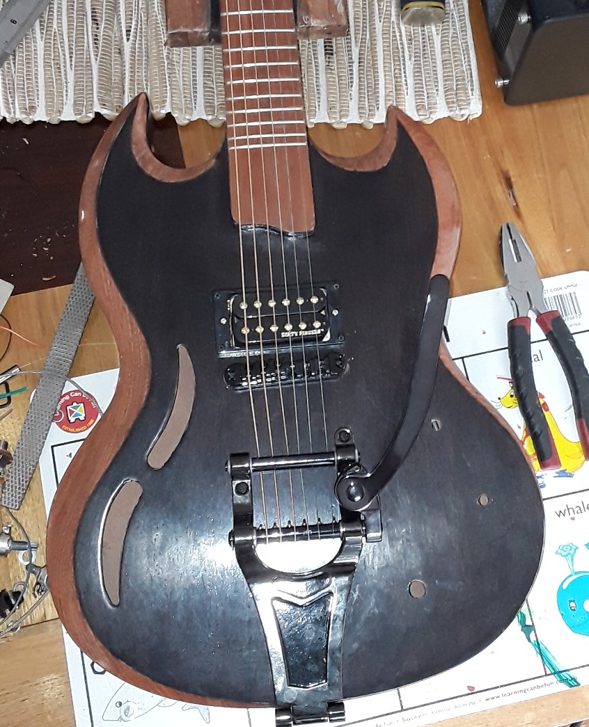Frets levelled and polished, first look at the red fret board with the black finish on the body Attachment 29456 Attachment 29457