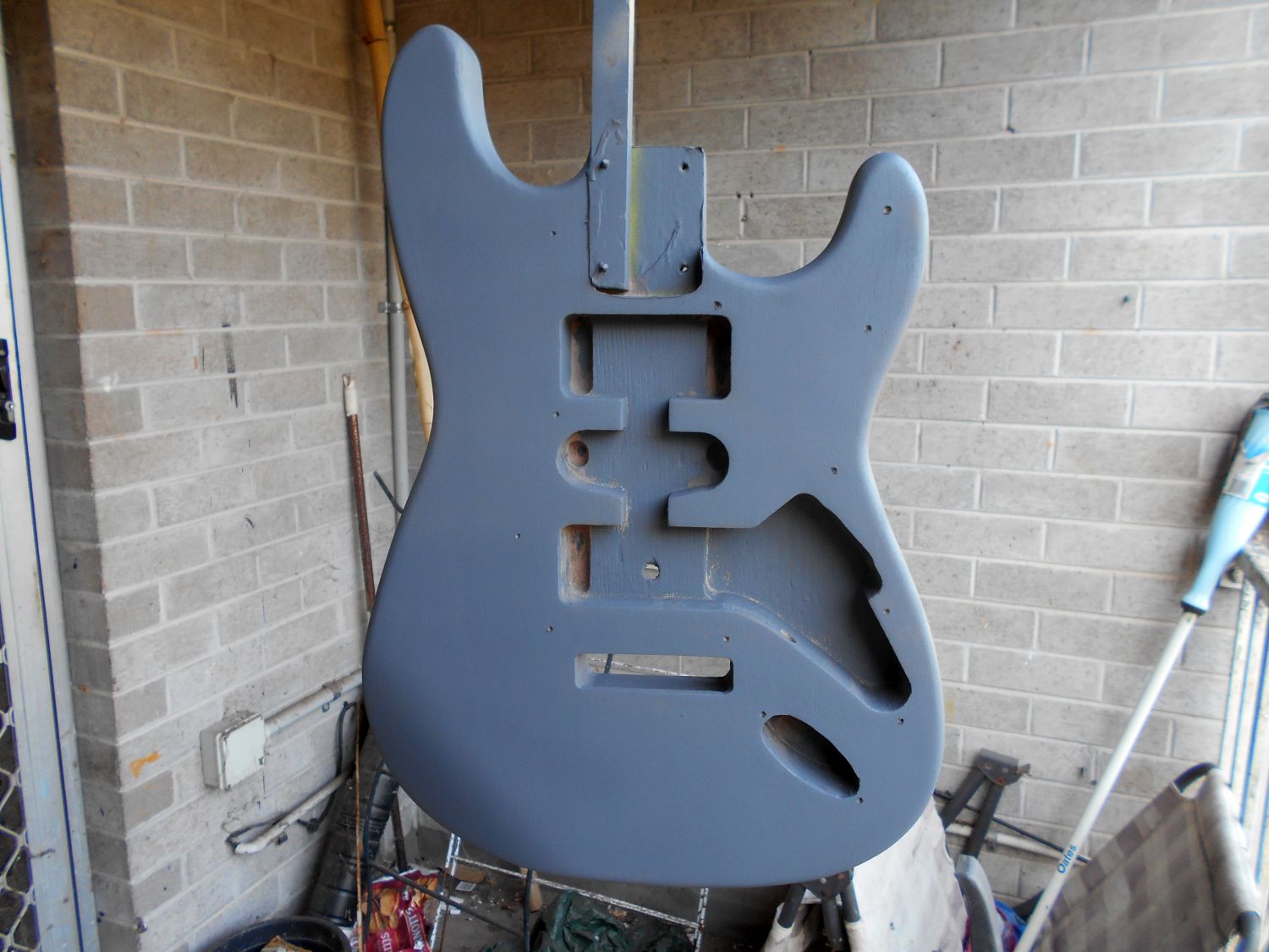 Just finished spraying a second coat of primer on the Gold Strat body, still no paint-runs so I've brought it inside so I can hang it up to dry overnight, will start spray-painting the body Gold tomorrow and will post some more pics of it too....stay tuned.