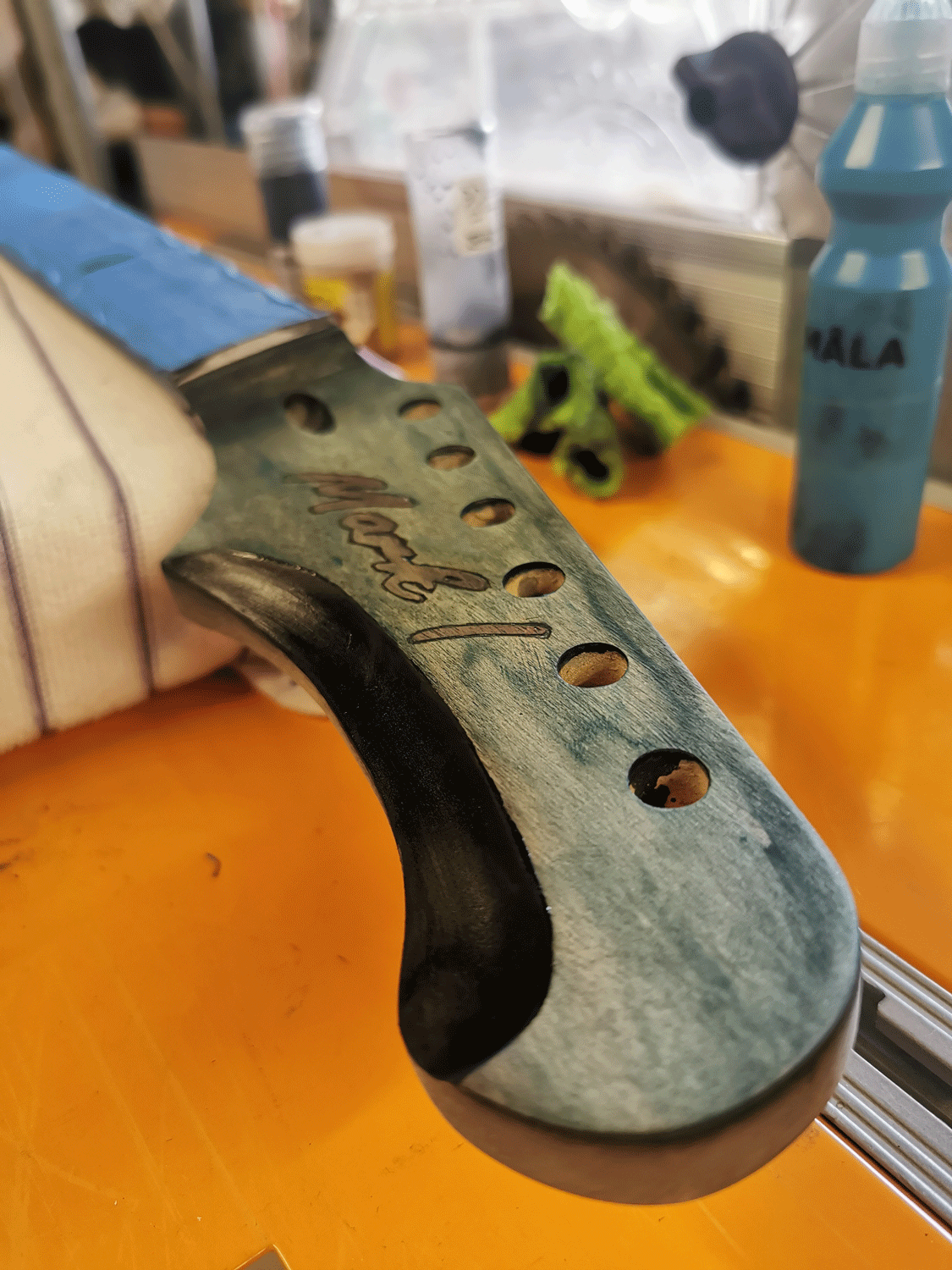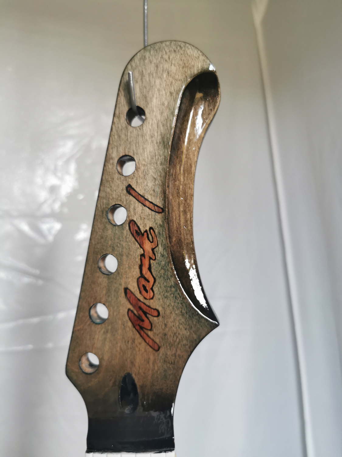 The maple is smoother and less absorbent than the body wood, so less sanding is required to get it flat, but I’d still put 4-6 coats on depending on the coat thickness, probably 6, especially as the neck has been stained. Any sand-through will leave a lighter patch which will be hard to fix in isolation, so it’s either sanding the whole neck down (I did that twice on the Hexacaster) and starting again, or touching up the clear coat and leaving the lighter patch.