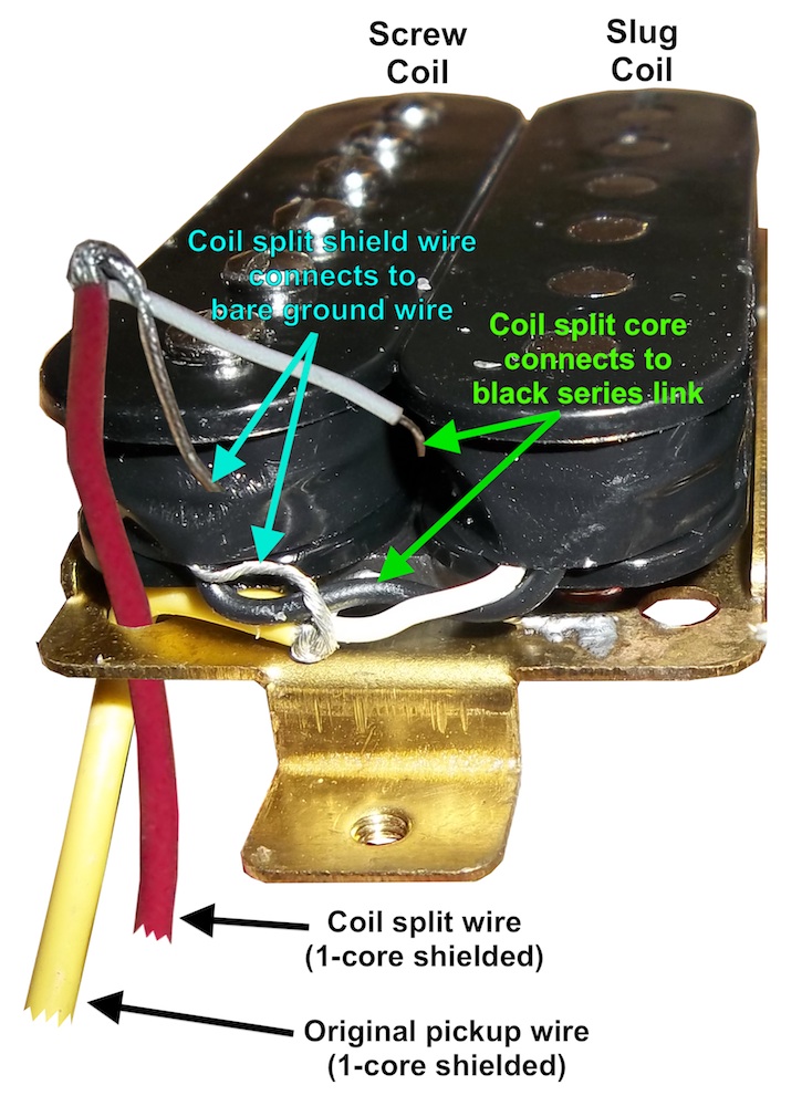 IMPORTANT: before you put the cover back on the pickup make a note of which coil the white 'hot' wire connects to. In the above image you can see the white core of the original pickup wire connects to the 'slug' coil (as opposed to the 'screw' coil). You need this information for each pickup when it comes to wiring your coil split switch. Check this on each pickup and write it down before you close them up, as it can very between pickups. For example, in this thread the bridge hot is the slug coil and the neck hot is the screw coil.