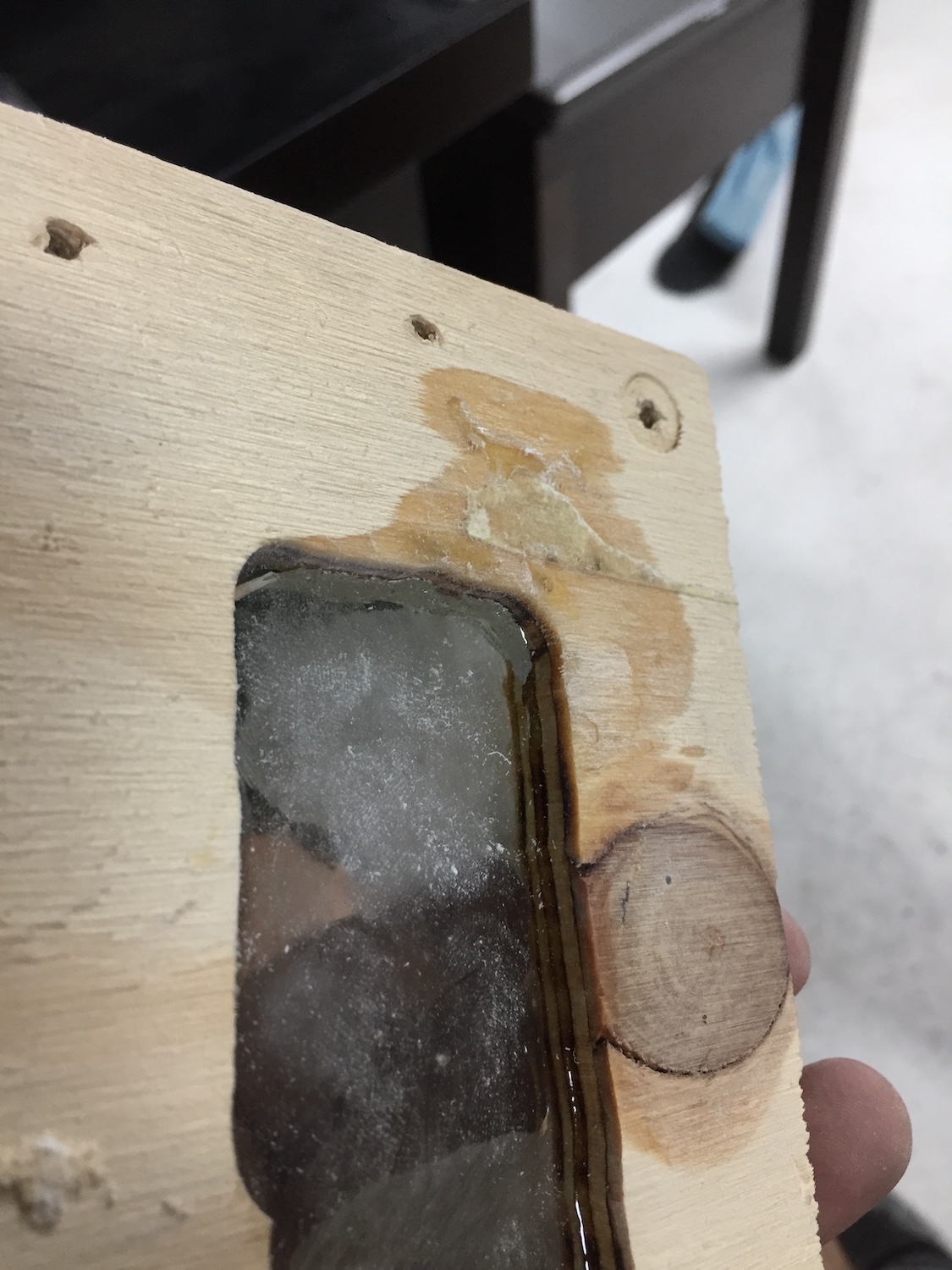 Given that there was a lots of rough surface for the resin to bind to in my little ply mould, the resin actually cracked through itself, rather than simply pull away from the mould. Given that both the Matai and the Merbau that border the pour area are quite smooth and close pored, this may cause the resin to simply let go.
