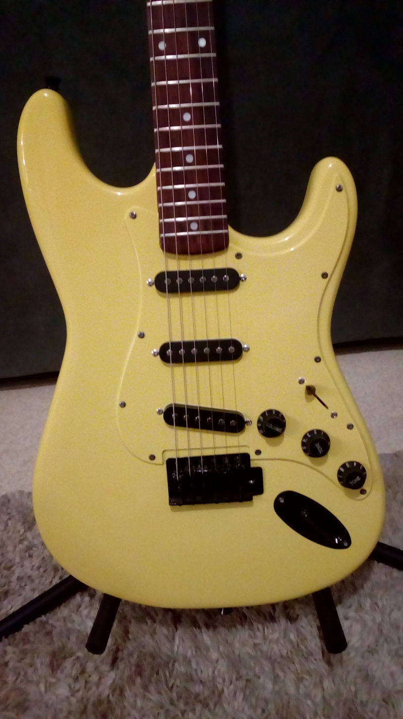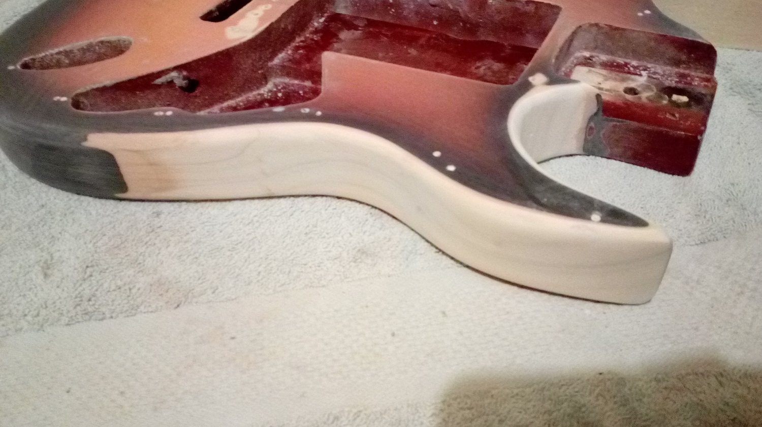 also cutting down a strat i dropped it a dented the paint so i figured why not as got heaps of strats have cut out the horns and around the middle about an inch, still might cut some more also have cut down the pick guard as a demo going to put humbuckers in it, i find to hard playing my Les Paul as it to heavy to balance it in my wheelchair