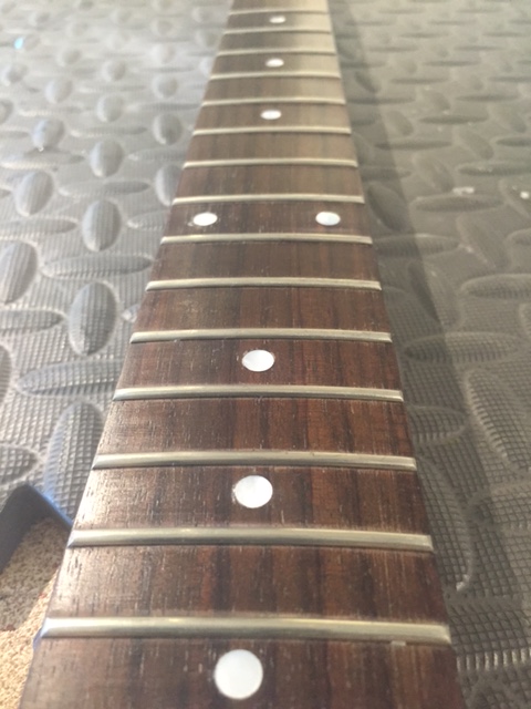 sanded down MOP dots prepared fret board and Dingo Waxxxxiness