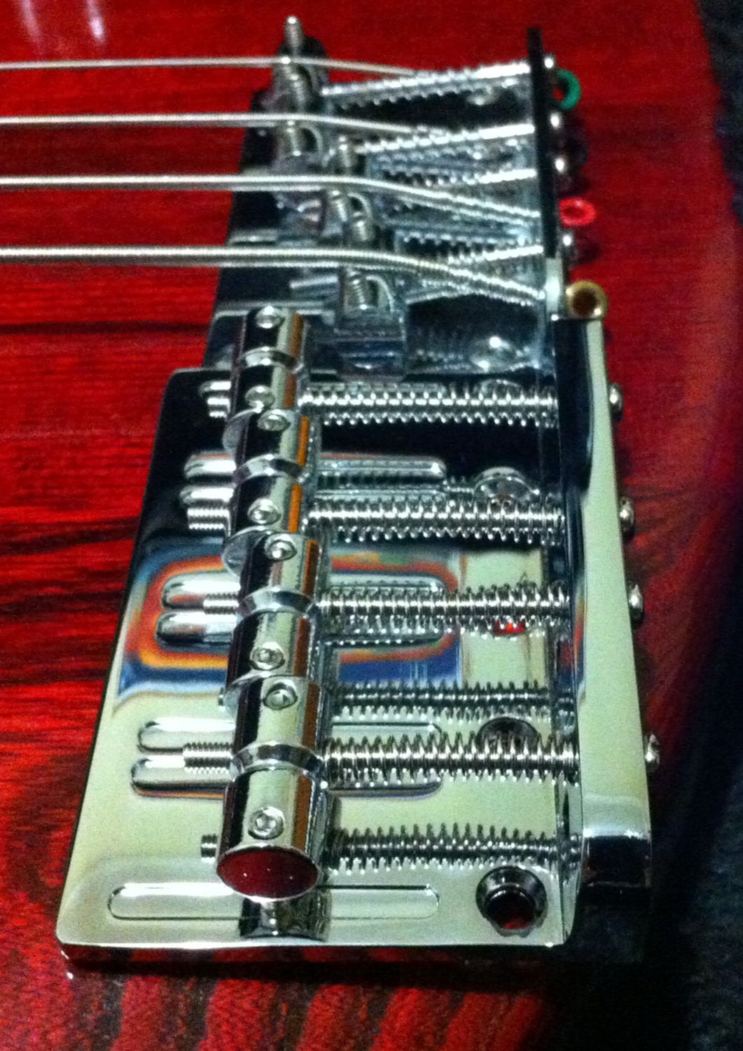 As a result, I want to get a different bridge, but most of that style of bridge use the same sized holes for all the strings - and the same size as all the holes in the equivalent 4-string bridges. This strikes me as wrong. I may also look at rear string mounting bridges, as I'm now happier about drilling through the body and fitting ferrules. But again, all the string ferrules seem to have the same sized holes! It may be time to get the drill out on those as well.
