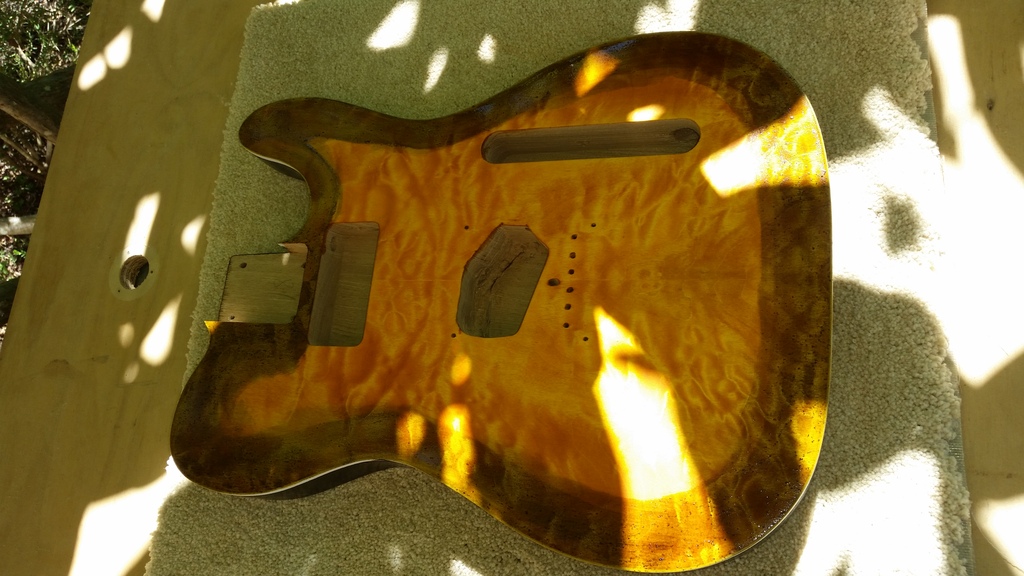 will need some more massaging DK, Maybe you should have started with a thinner burst. It's important to really work the blend line when both stains are still soaking in. Next coat just try working CG and blend the transition