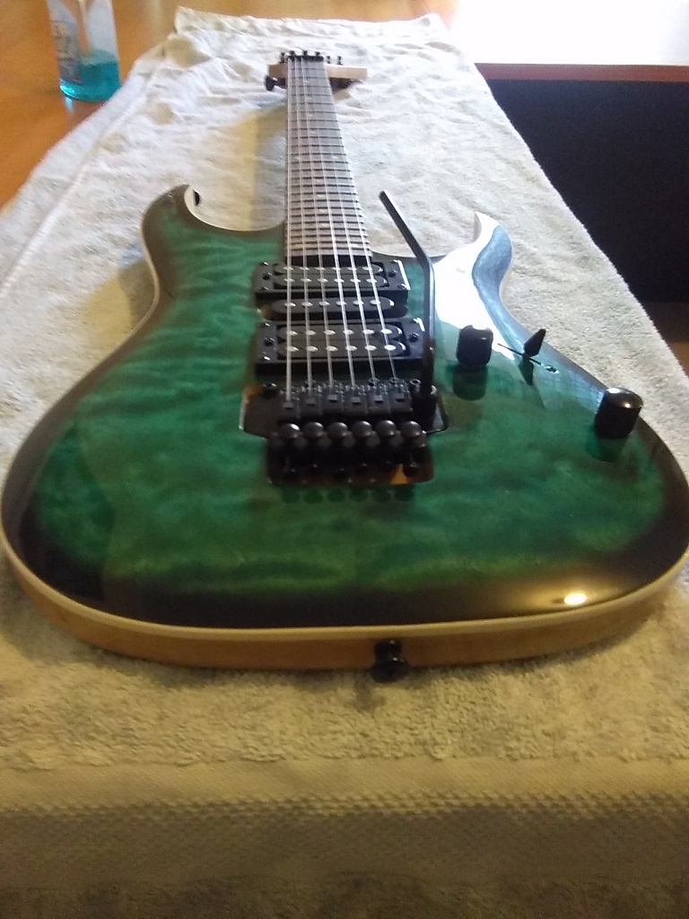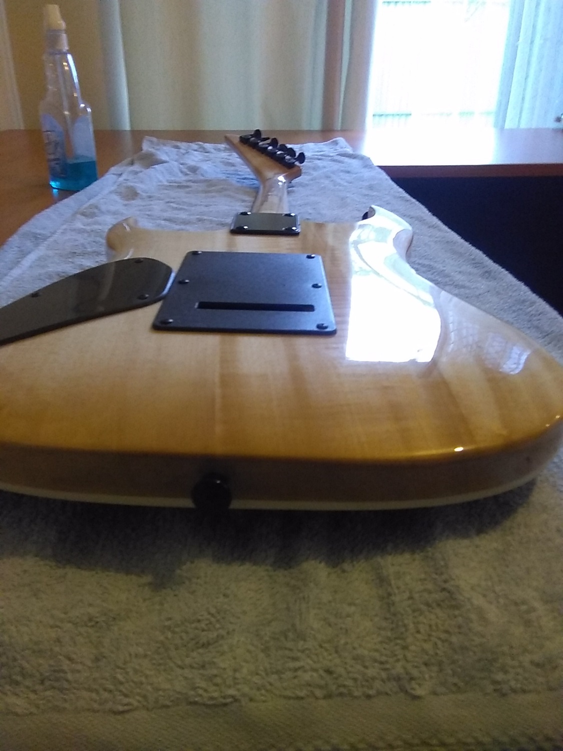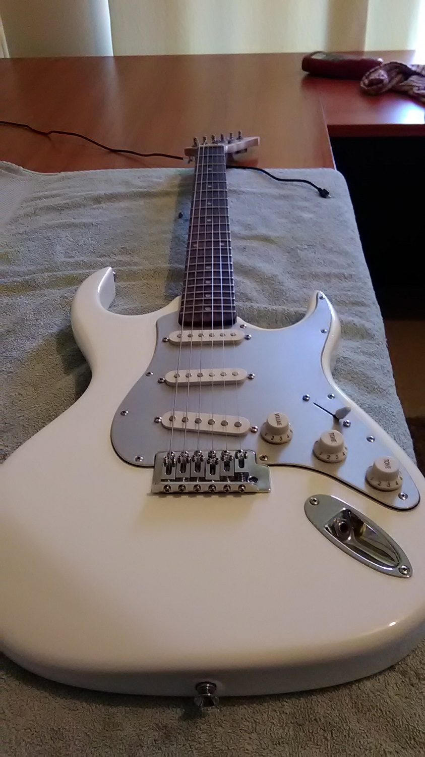 Hi guys here's my latest strat i cut down the body a bit on horns and slimmed down the center as well as pick guard sprayed by rattle can whole job its just a plain white with clear over it and silver, not much more to add except i'm pleased with it here's some pic's of it