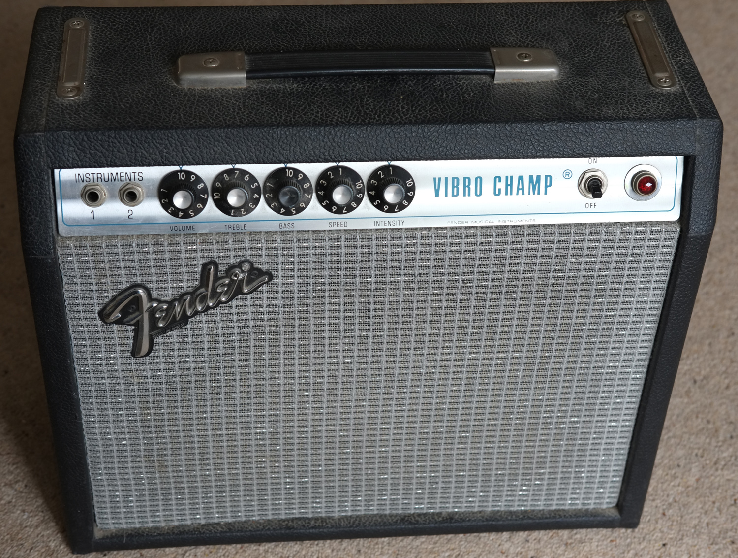I've borrowed a friends '81 Fender Vibro Champ. 5W with a 4-Ohm 8" Eminence speaker. One 6V6 power tube, one 12AX7 for the preamp, one 12AX7 tube for the tremolo circuit and a 5Y3GT for the rectifier. The tremolo circuit uses power tube grid bias adjustment to change the volume. The circuitry (AA764) hadn't changed since the Blackface model Vibro Champ was introduced in 1964, though the fitted speaker has changed over the years.